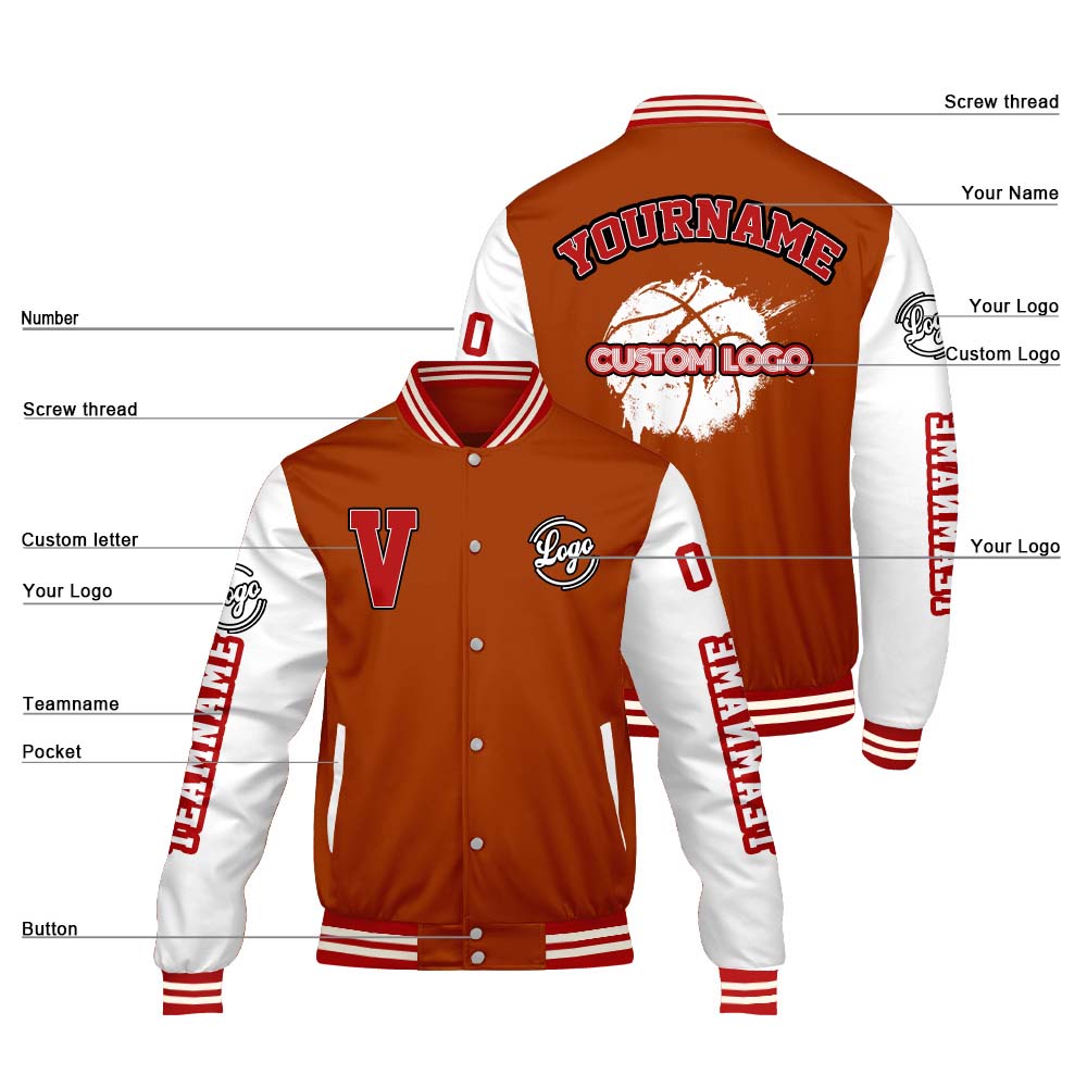 Maßgeschneiderte Orange Weiß Letterman Varsity Jacket Individuelle Stickerei Druck nach Ihrem Wunsch