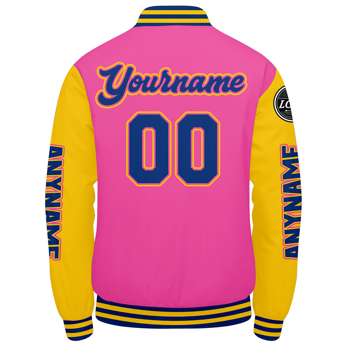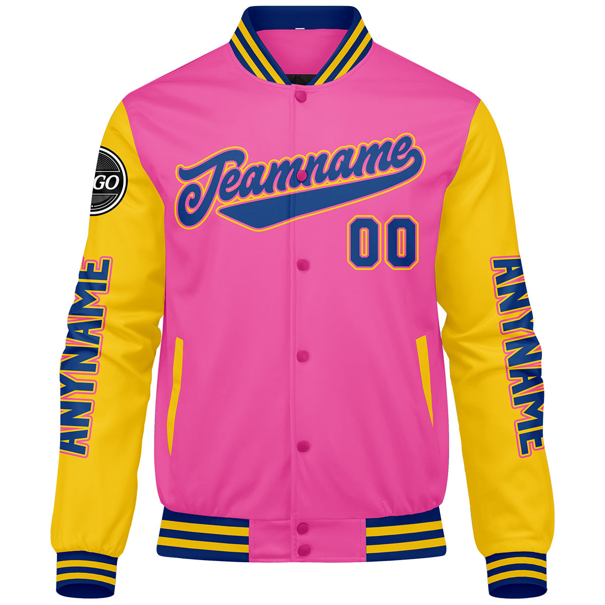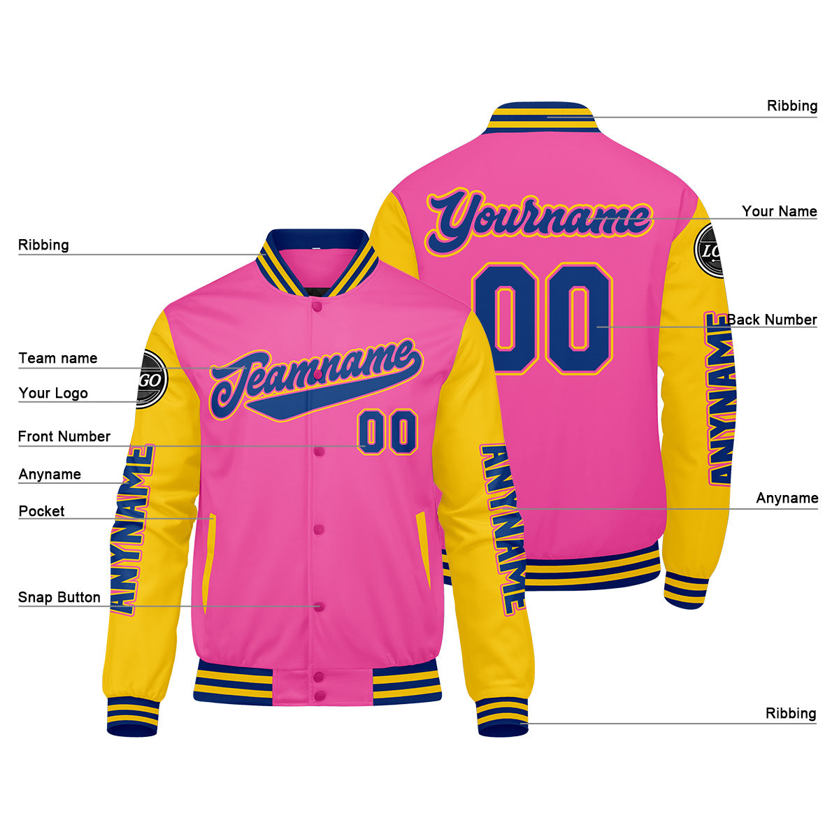 Maßgeschneiderte Rosa Gelb Königlich Letterman Varsity Jacket Individuelle Stickerei Druck nach Ihrem Wunsch