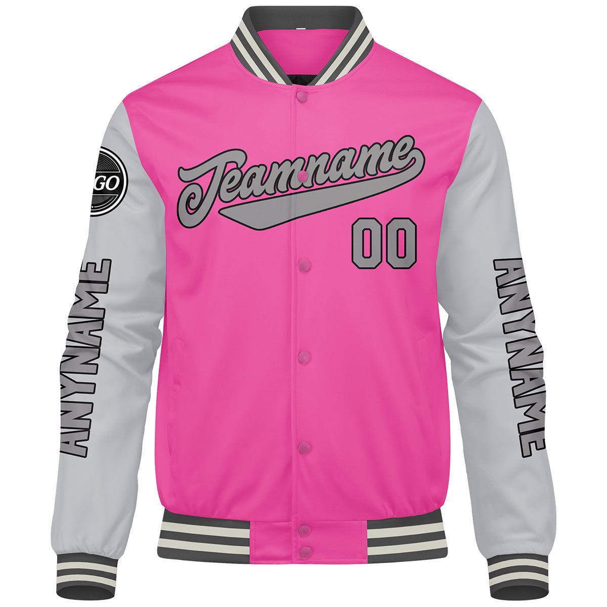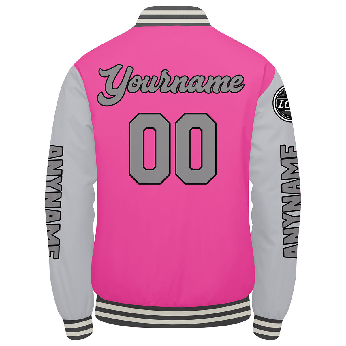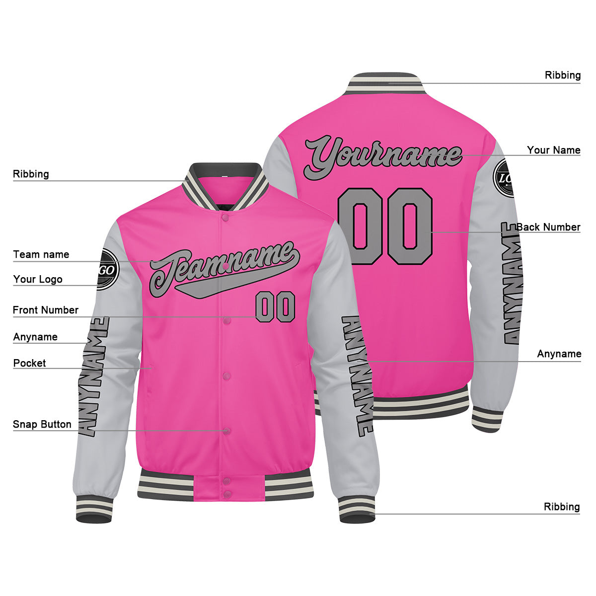 Maßgeschneiderte Rosa Grau Letterman Varsity Jacket Individuelle Stickerei Druck nach Ihrem Wunsch