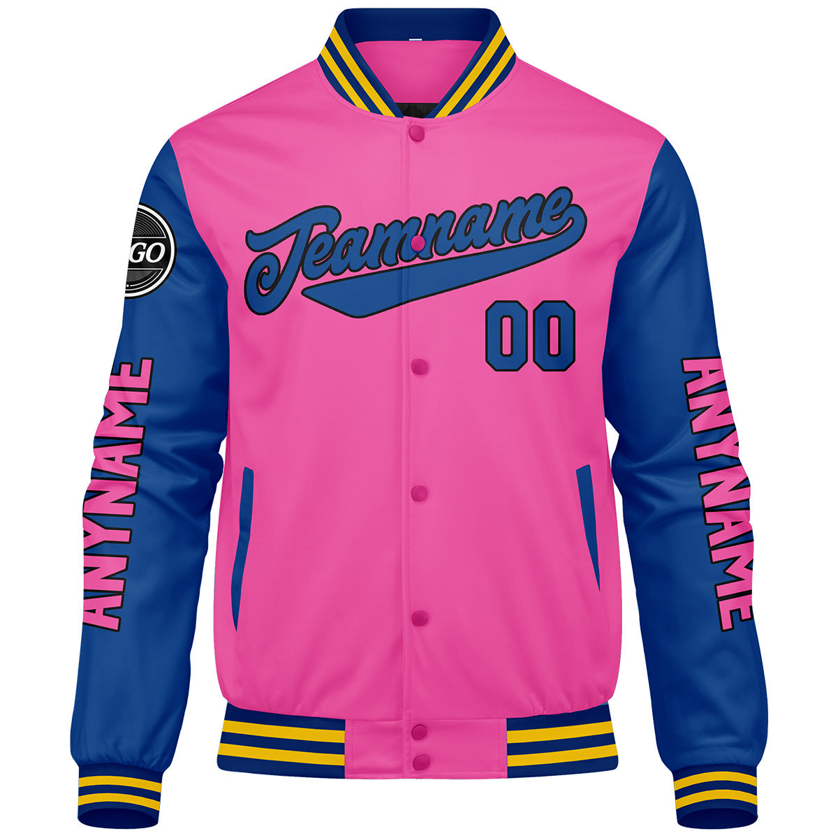 Maßgeschneiderte Rosa Königliches Gelb Letterman Varsity Jacket Individuelle Stickerei Druck nach Ihrem Wunsch