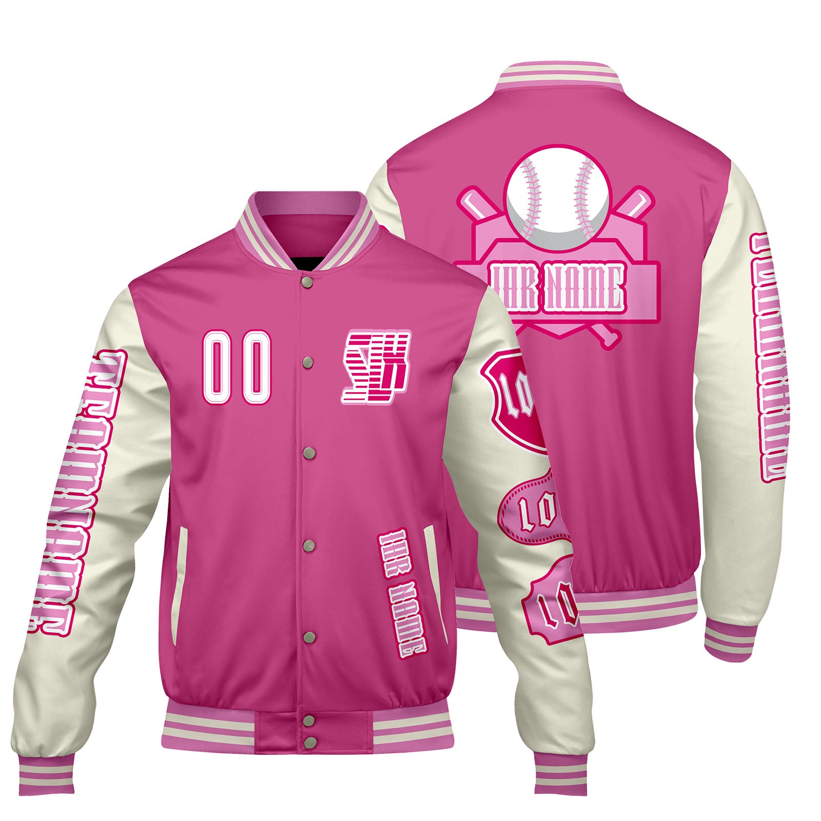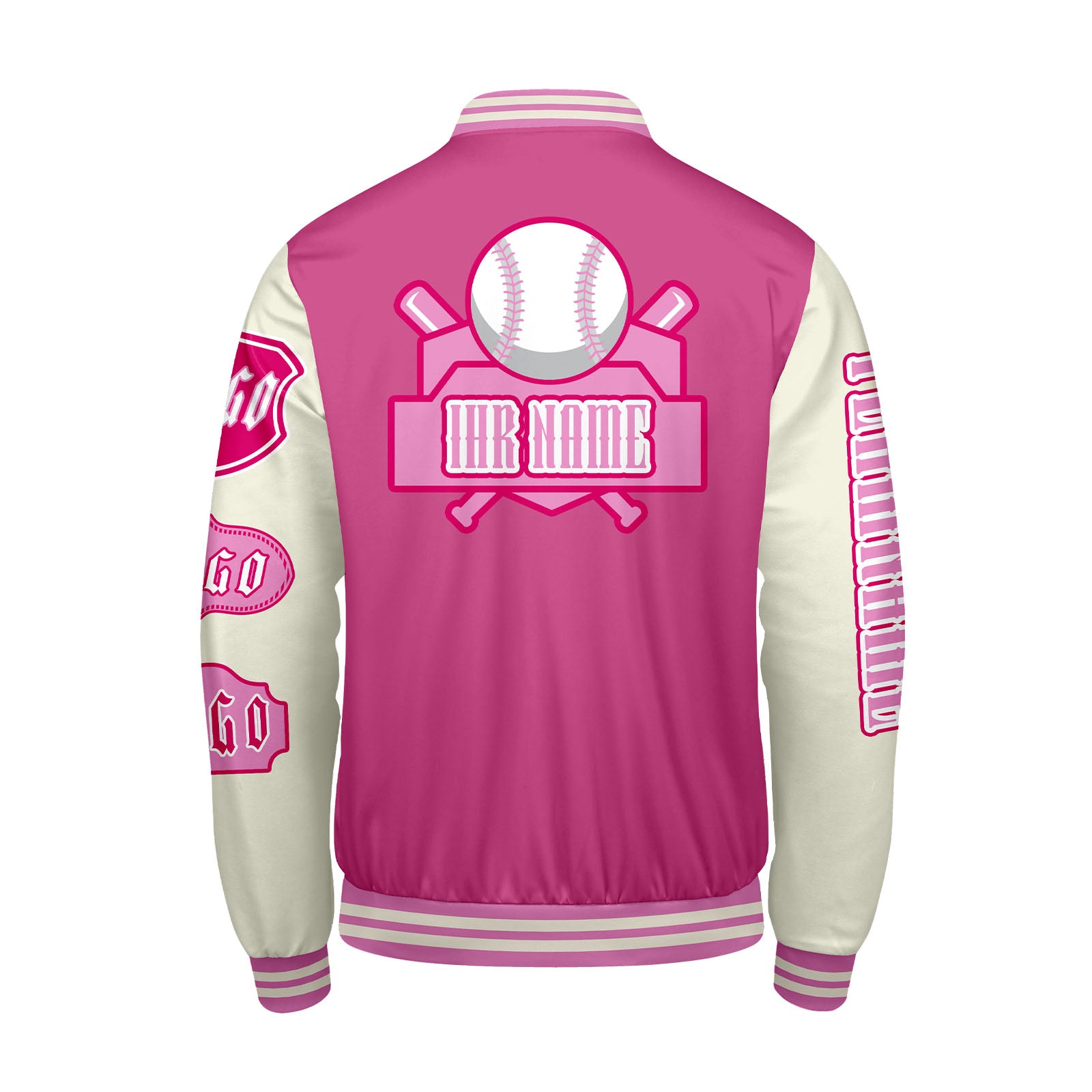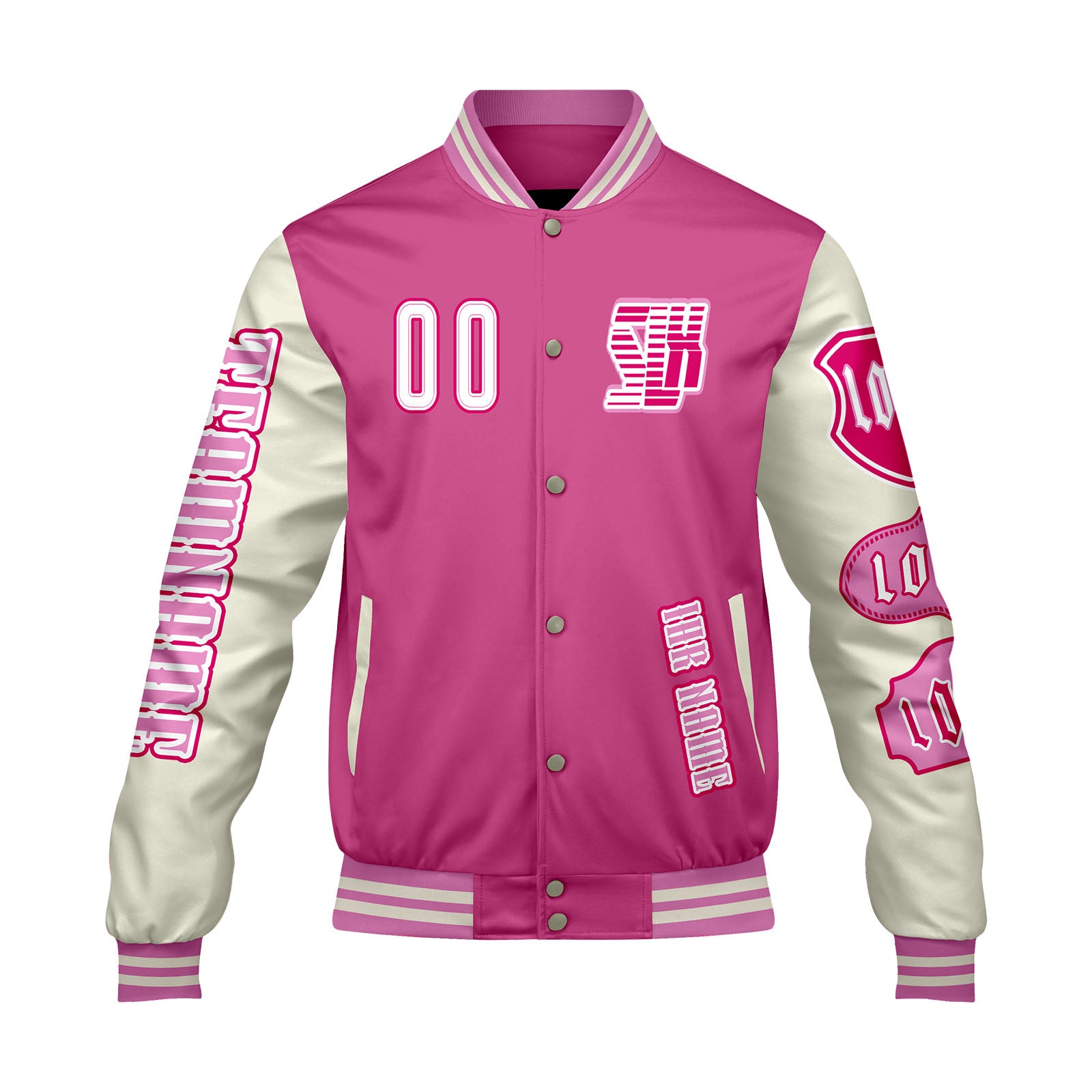 Maßgeschneiderte Rosa Weiß Letterman Varsity Jacket Individuelle Stickerei  Druck nach Ihrem Wunsch