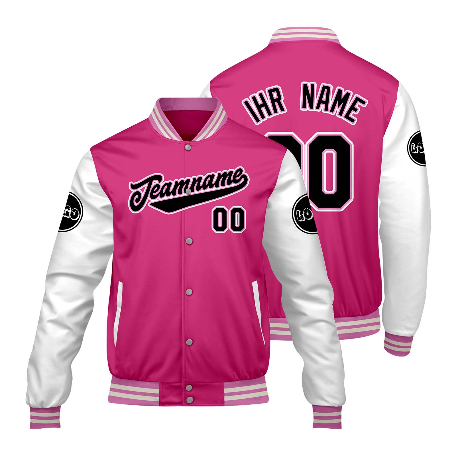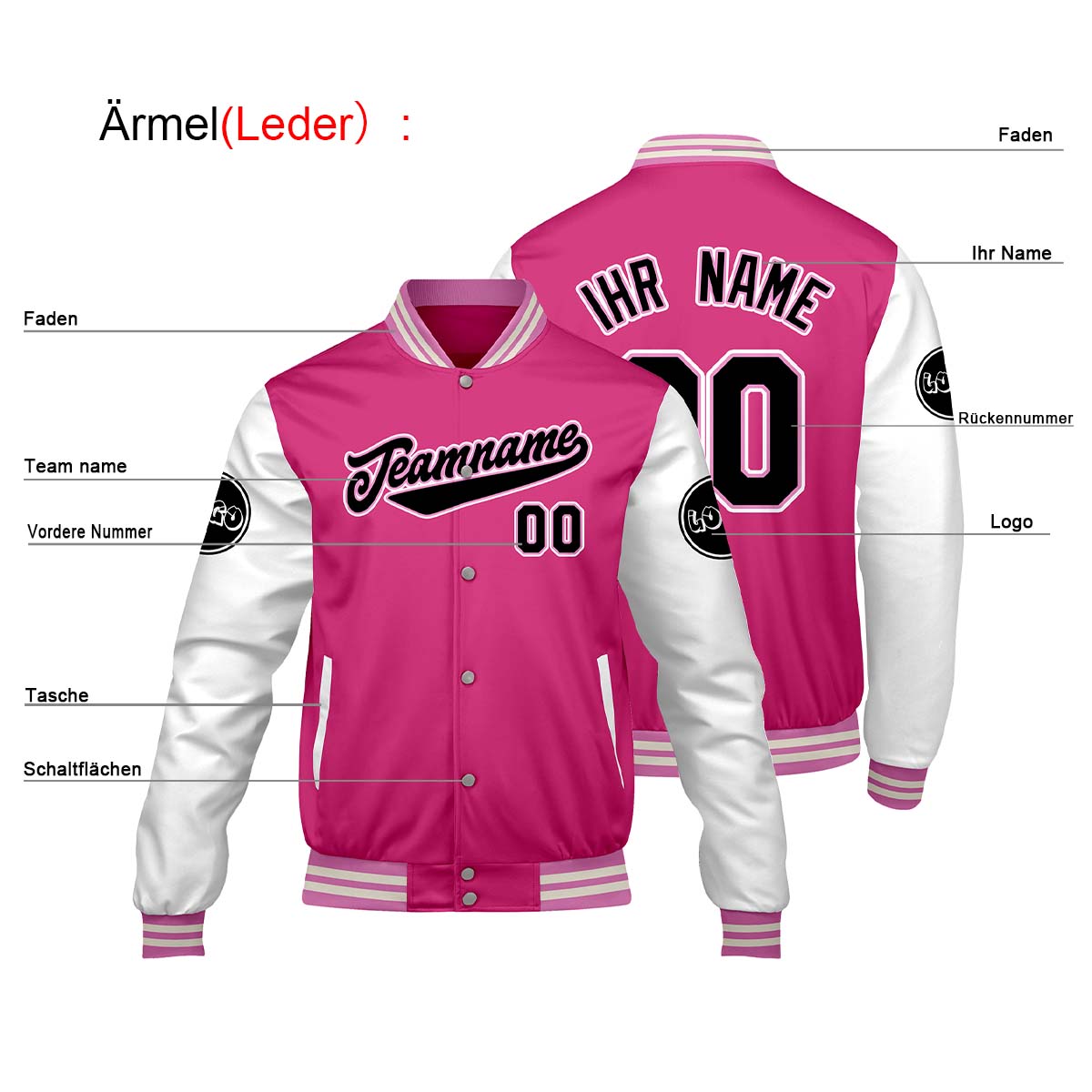 Maßgeschneiderte Rosa Weiß Letterman Varsity Jacket Individuelle Stickerei Druck nach Ihrem Wunsch