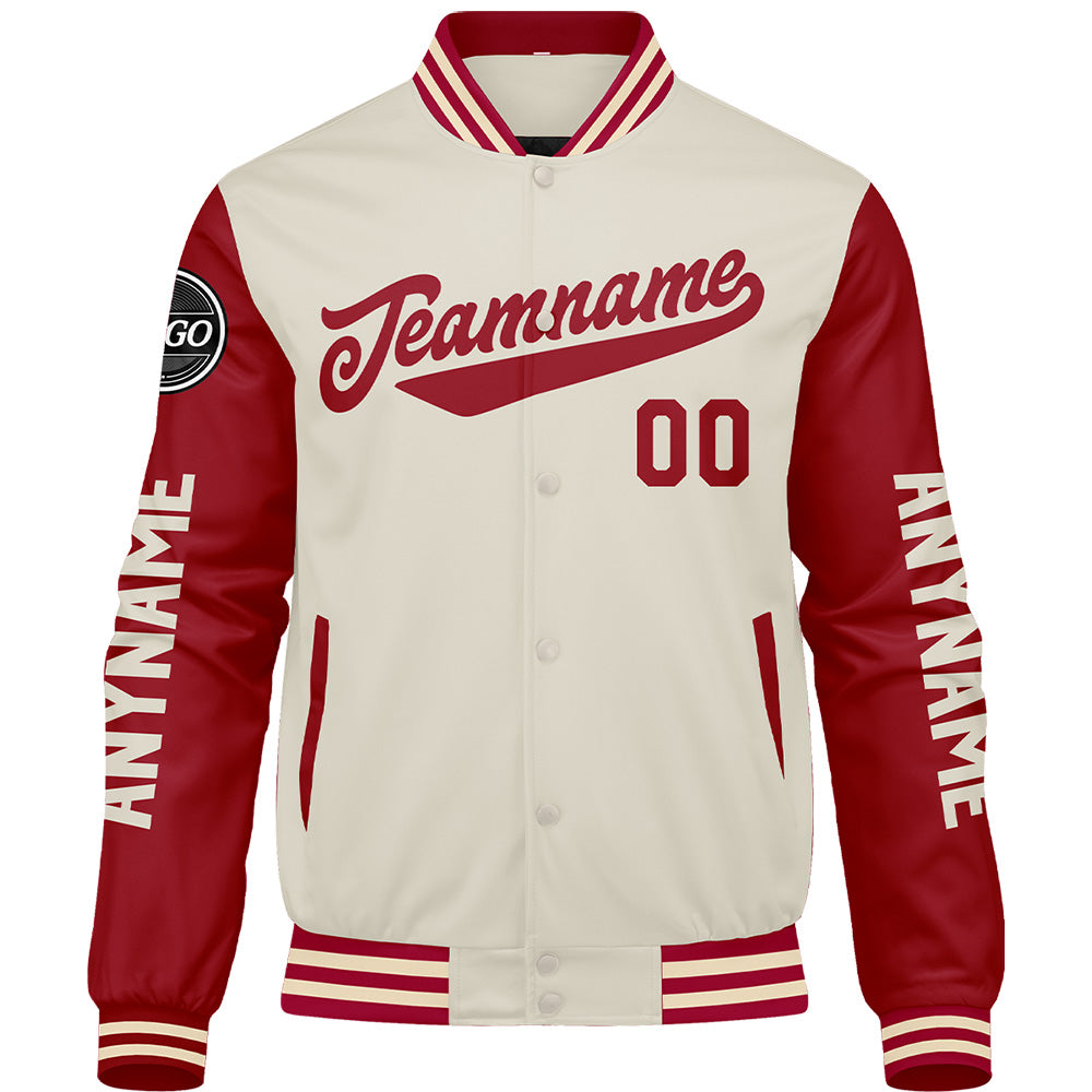 Maßgeschneiderte Rot Creme Letterman Varsity Jacket Individuelle Stickerei Druck nach Ihrem Wunsch