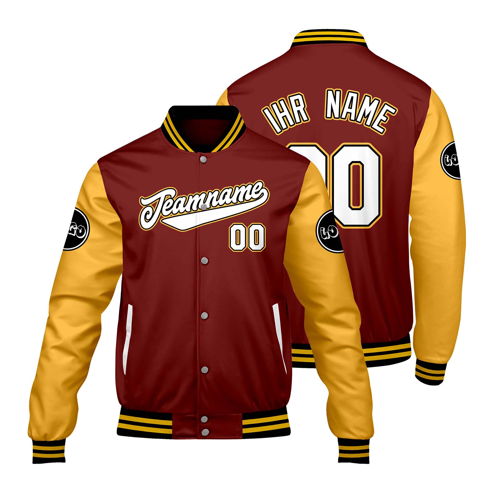 Maßgeschneiderte Rot Gelb Letterman Varsity Jacket Individuelle Stickerei Druck nach Ihrem Wunsch