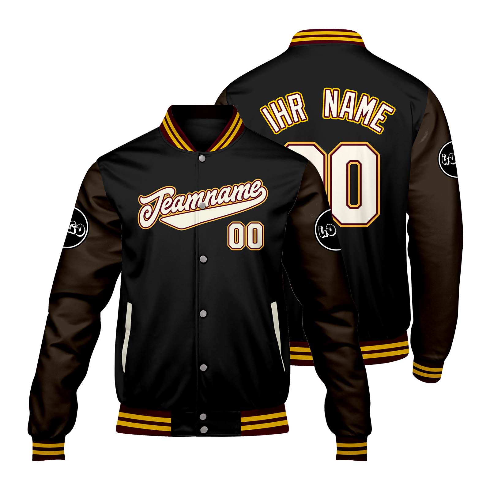 Maßgeschneiderte schwarz Braun Letterman Varsity Jacket Individuelle Stickerei Druck nach Ihrem Wunsch