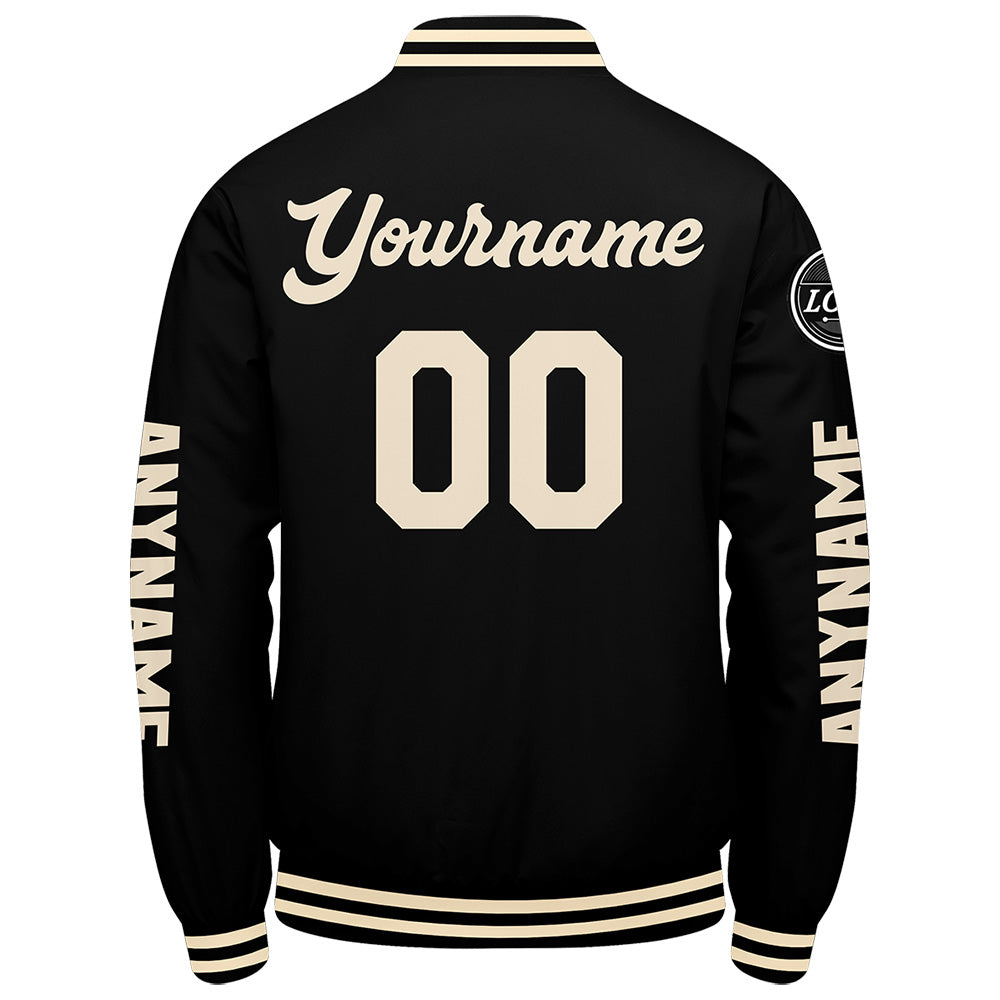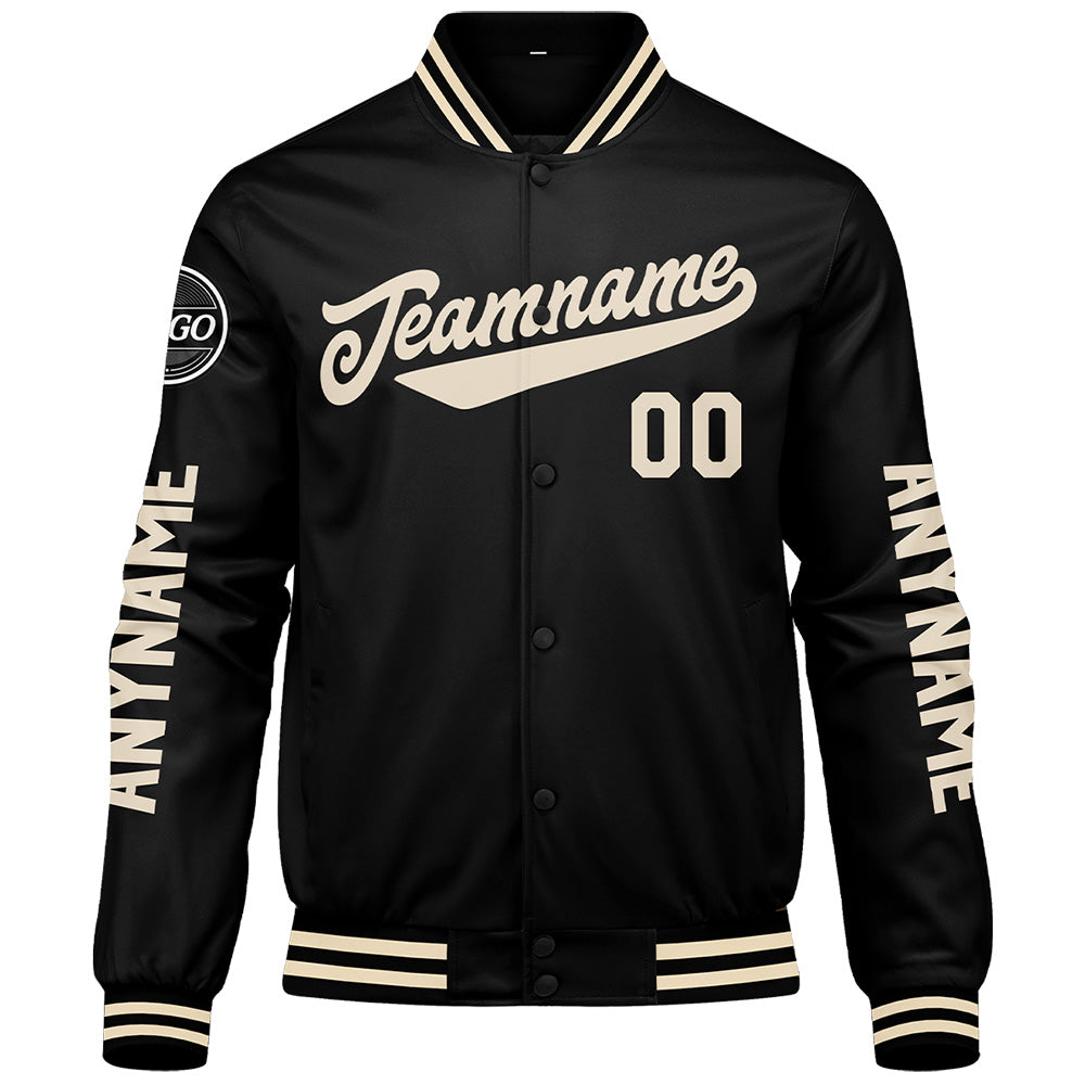 Maßgeschneiderte Schwarz Creme Letterman Varsity Jacket Individuelle Stickerei Druck nach Ihrem Wunsch