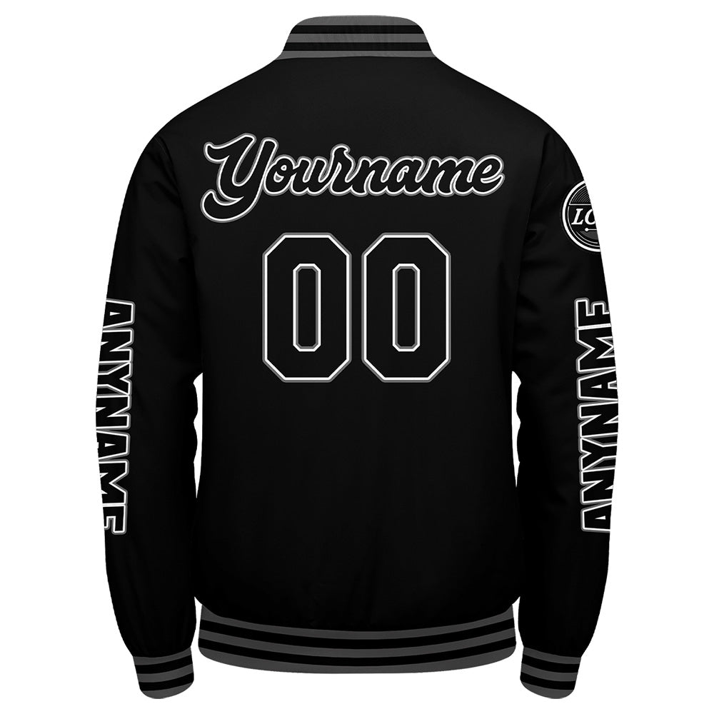 Maßgeschneiderte Schwarz Grau Letterman Varsity Jacket Individuelle Stickerei Druck nach Ihrem Wunsch