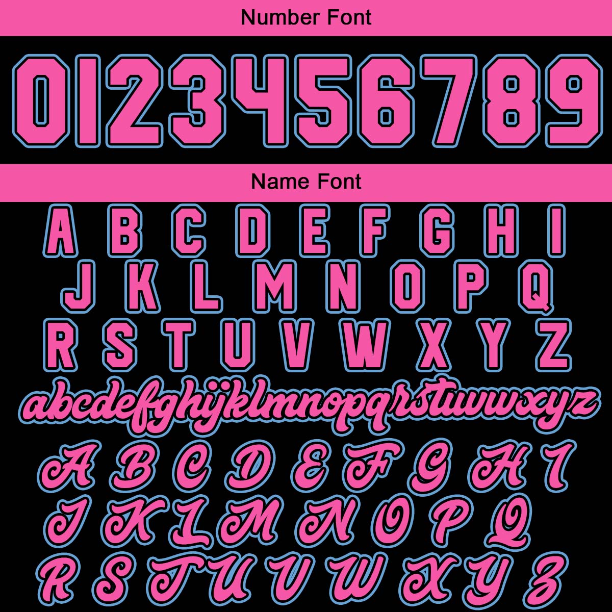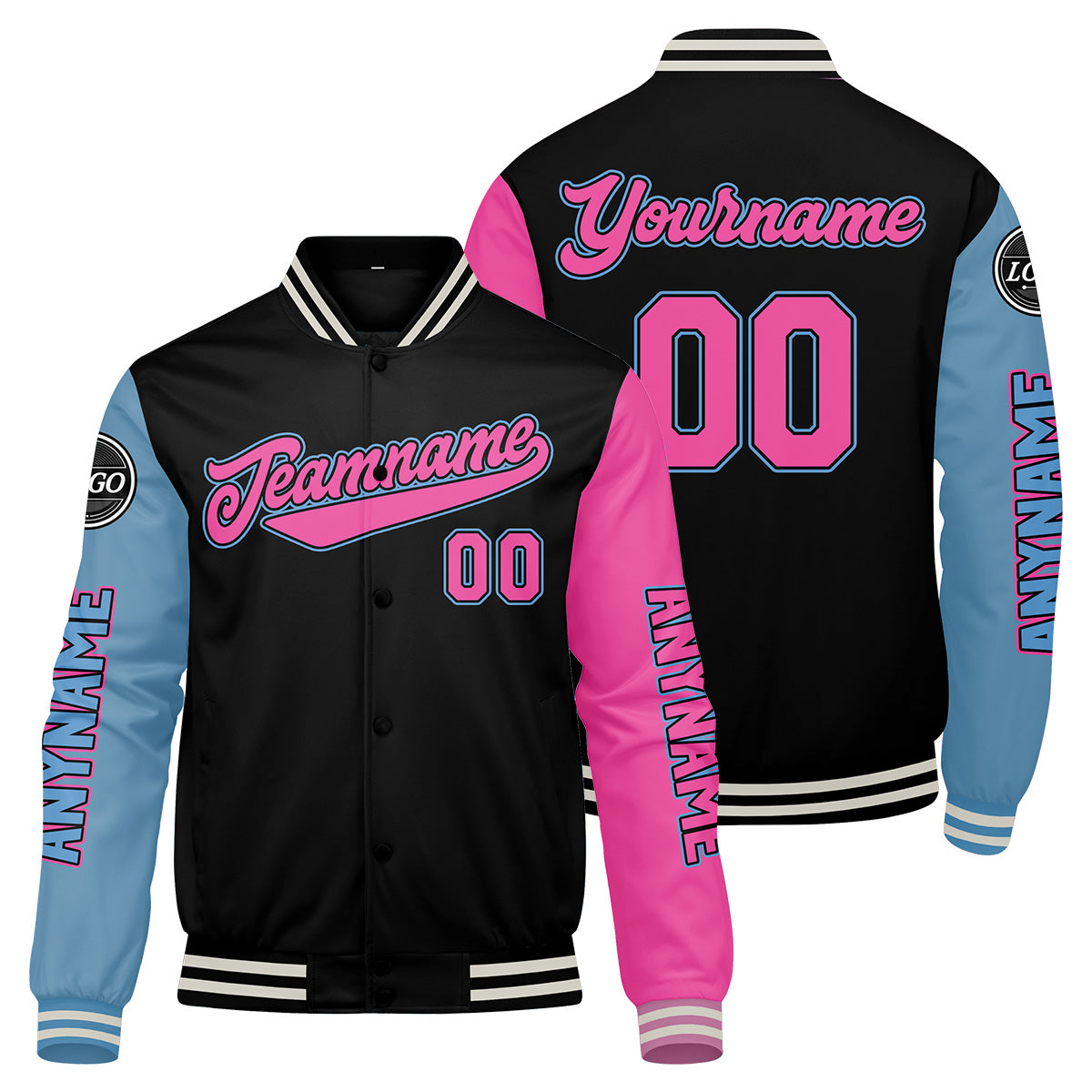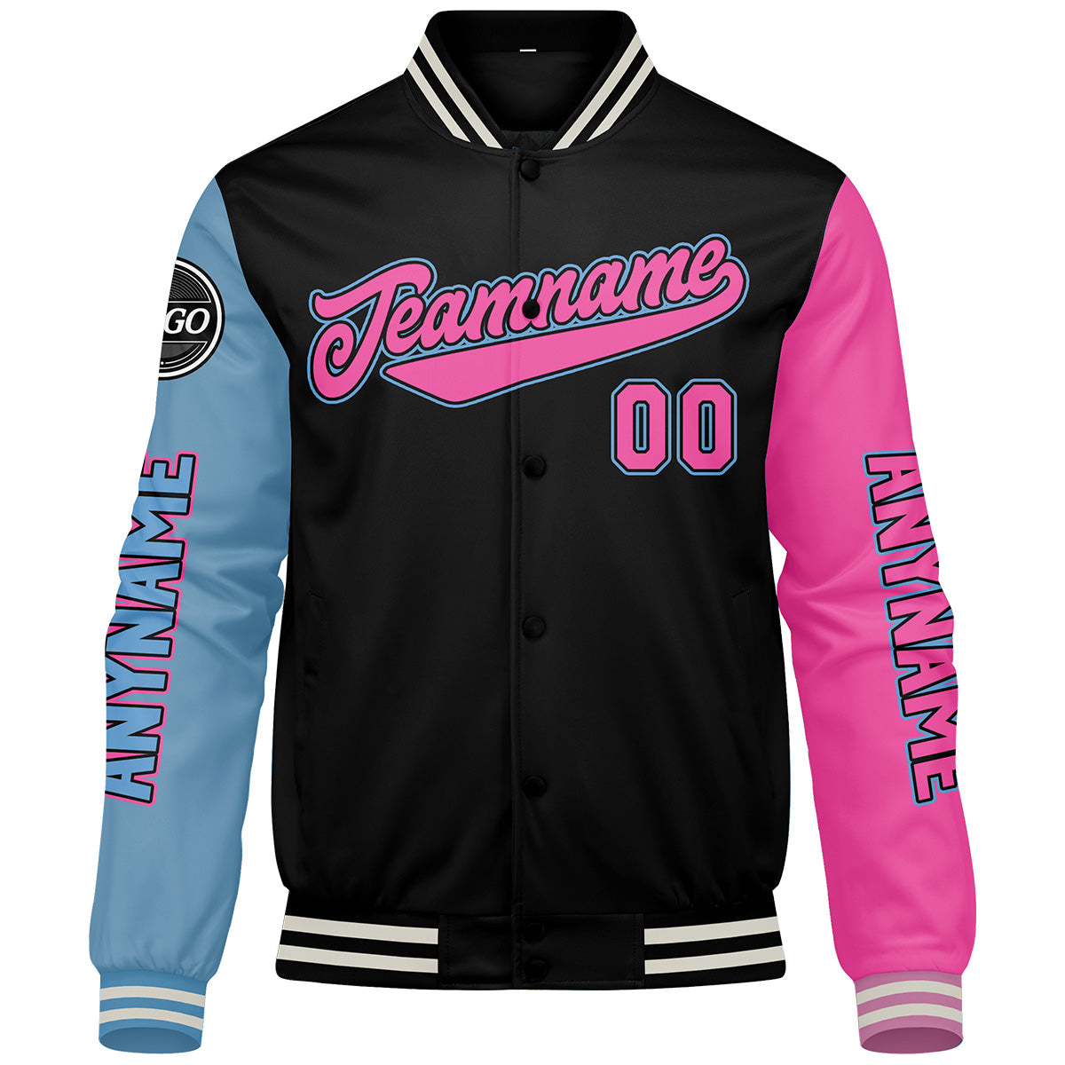Maßgeschneiderte Schwarz Hellblau Rosa Letterman Varsity Jacket Individuelle Stickerei Druck nach Ihrem Wunsch