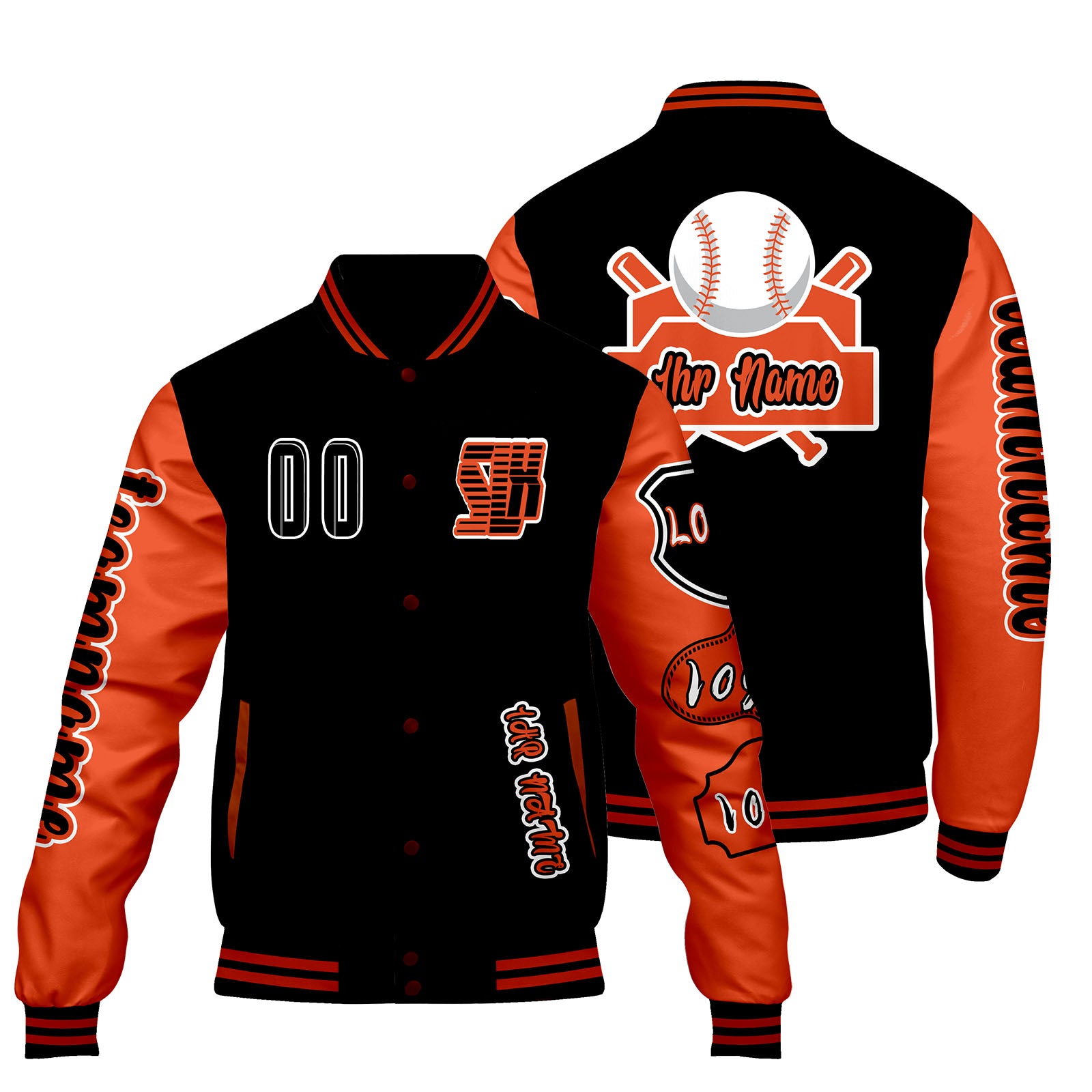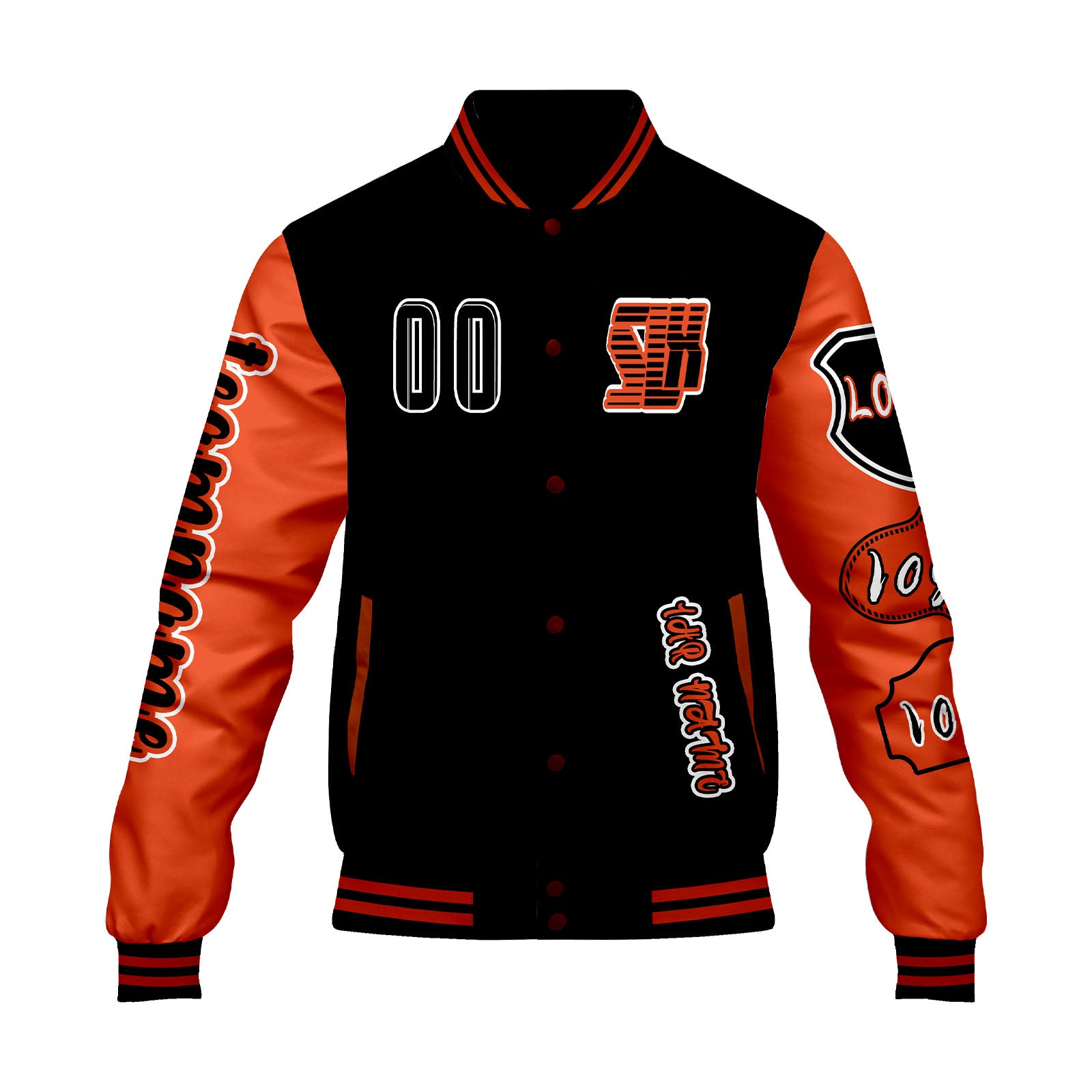 Maßgeschneiderte Schwarz Orange Letterman Varsity Jacket Individuelle Stickerei Druck nach Ihrem Wunsch