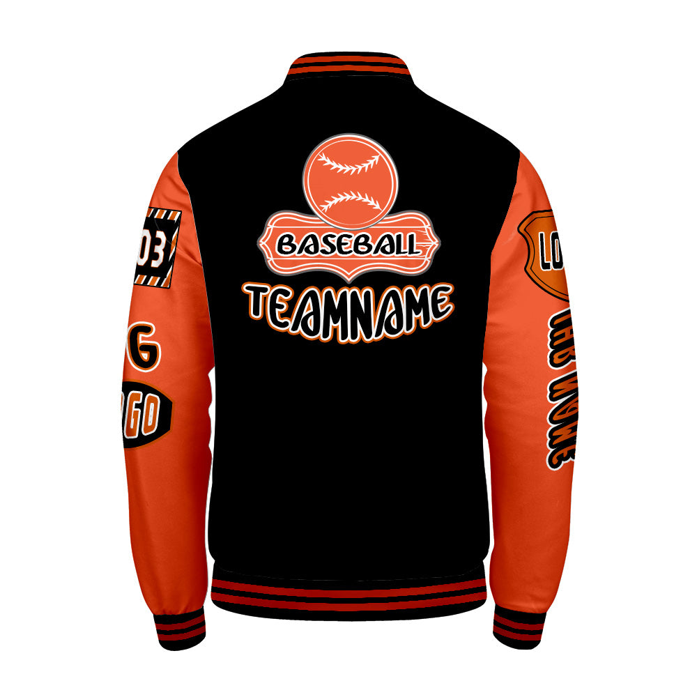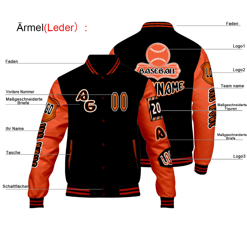 Maßgeschneiderte Schwarz Orange Letterman Varsity Jacket Individuelle Stickerei Druck nach Ihrem Wunsch