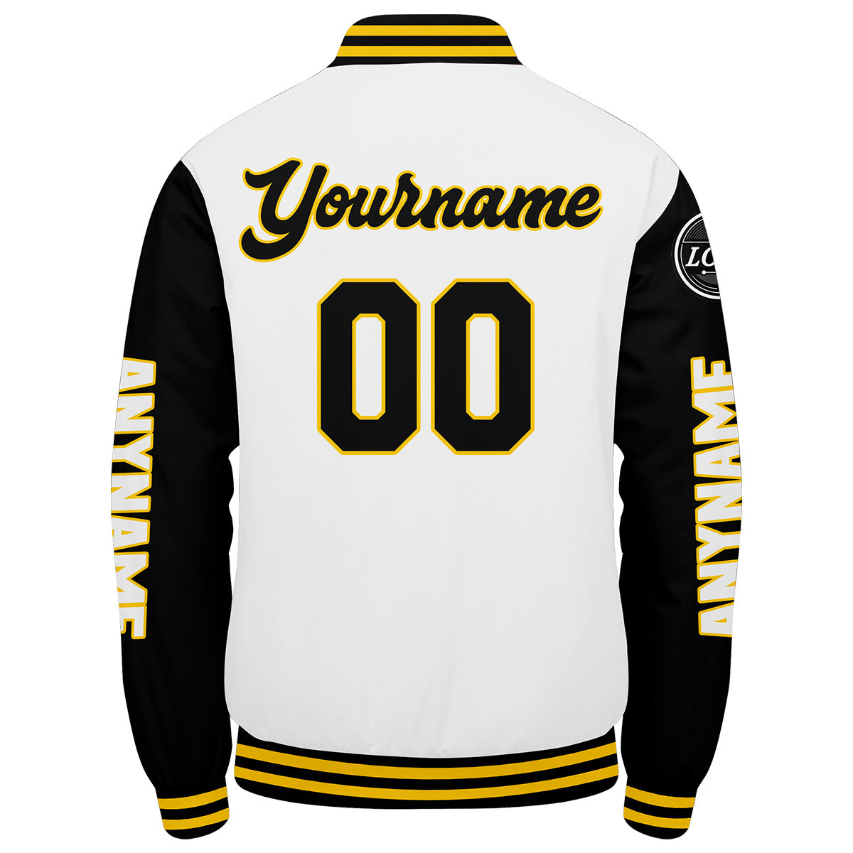 Maßgeschneiderte Schwarz Weiß Gelb Letterman Varsity Jacket Individuelle Stickerei Druck nach Ihrem Wunsch