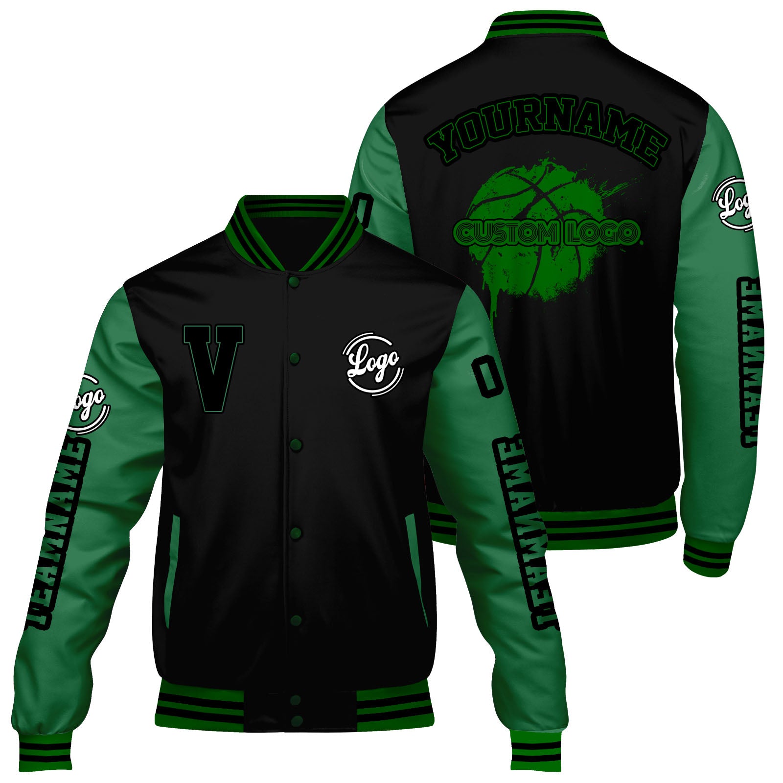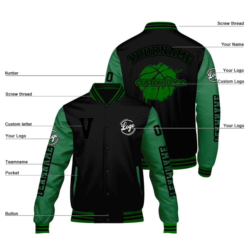 Maßgeschneiderte Schwarzes Gras Grün Letterman Varsity Jacket Individuelle Stickerei Druck nach Ihrem Wunsch