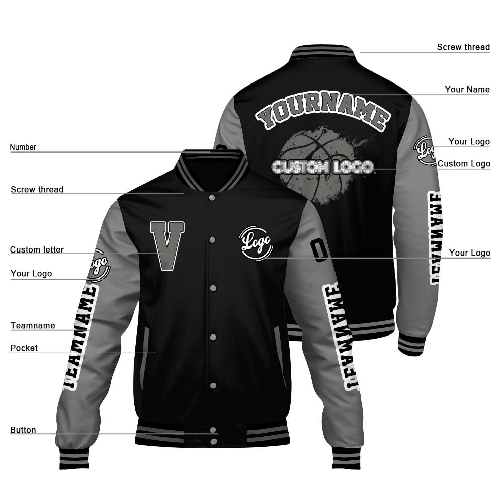 Maßgeschneiderte Schwarzes Grau Letterman Varsity Jacket Individuelle Stickerei Druck nach Ihrem Wunsch