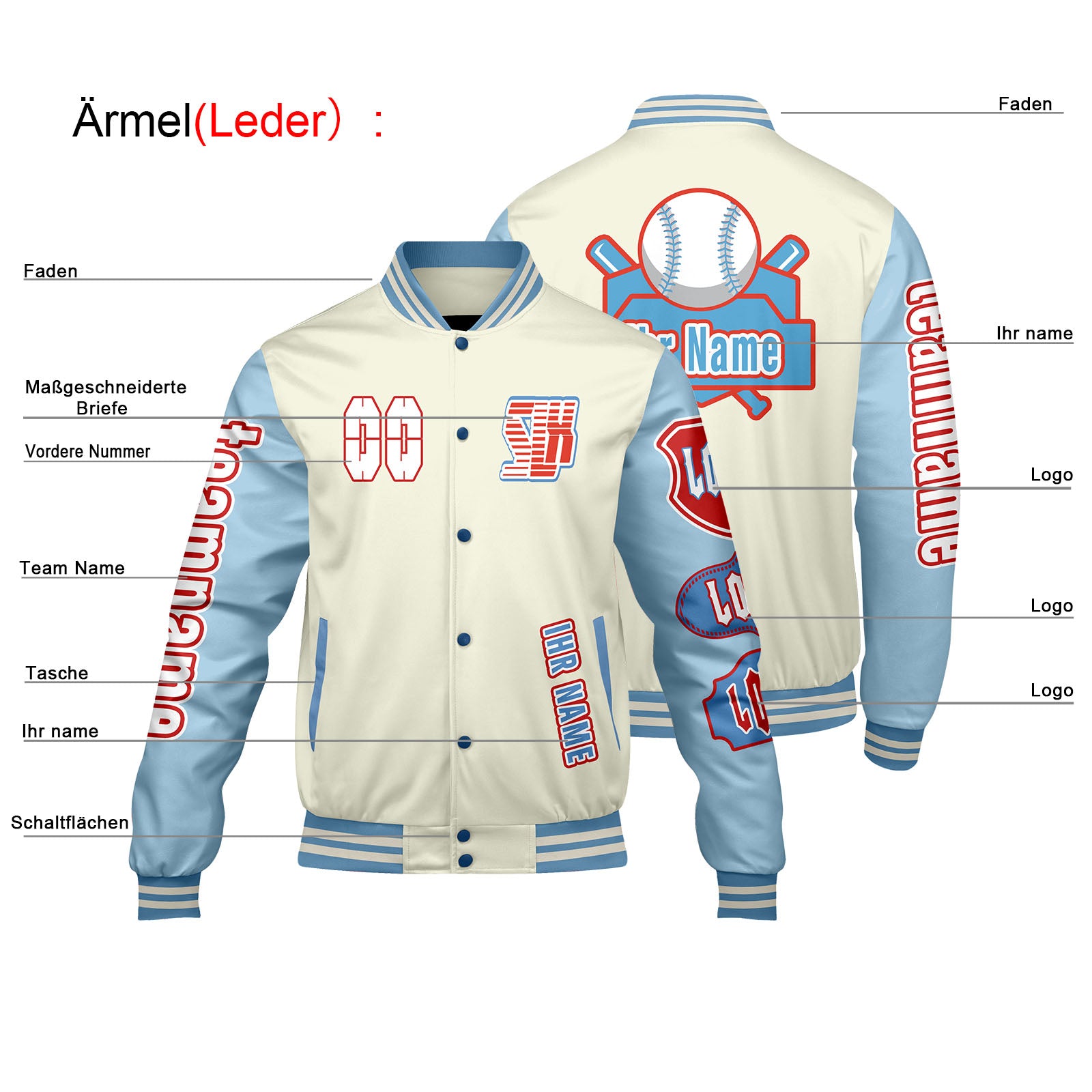 Maßgeschneiderte Weiß Blau Letterman Varsity Jacket Individuelle Stickerei  Druck nach Ihrem Wunsch