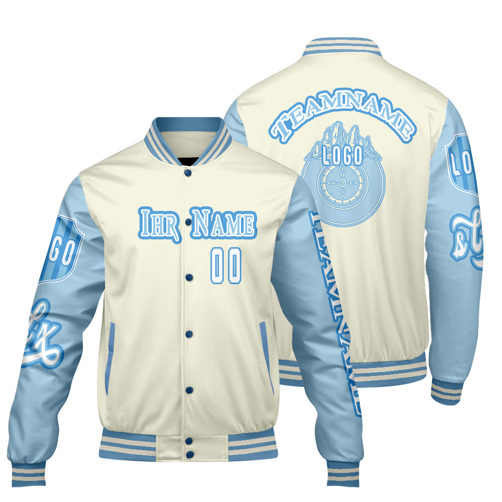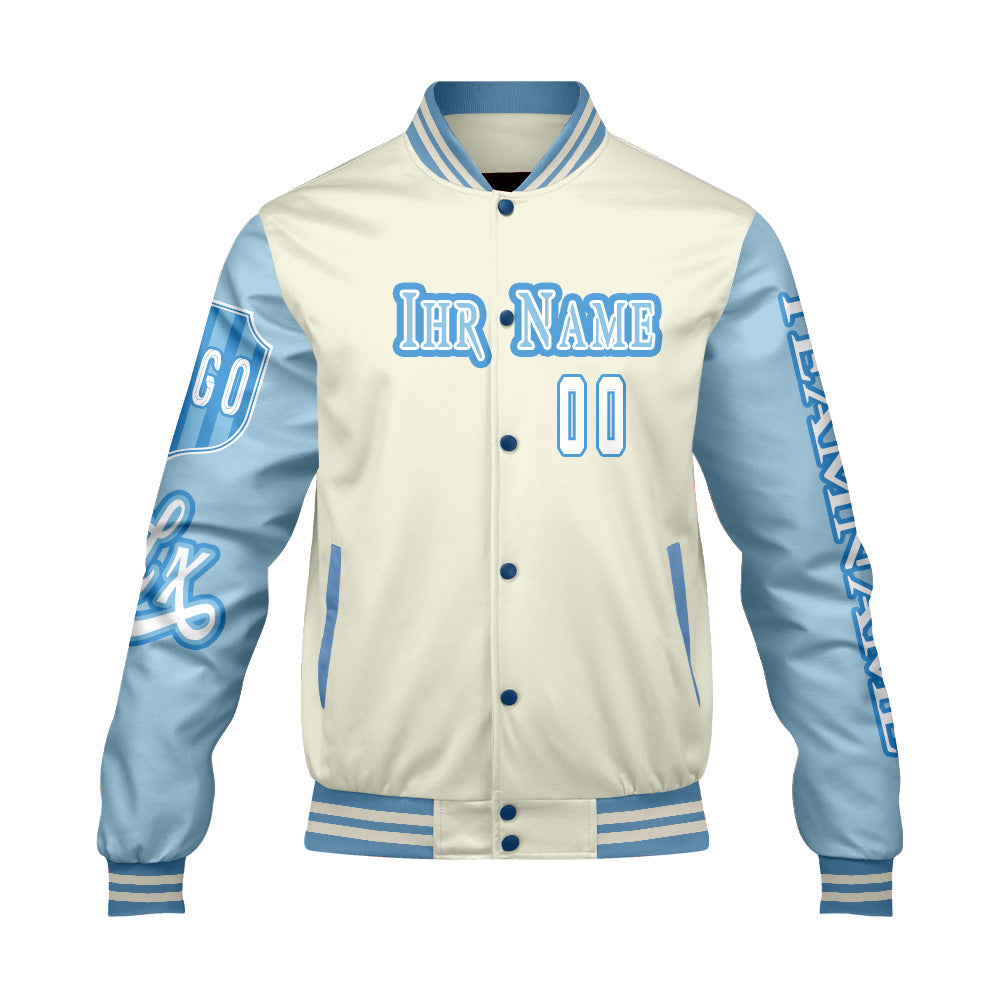 Maßgeschneiderte Weiß Blau Letterman Varsity Jacket Individuelle Stickerei  Druck nach Ihrem Wunsch