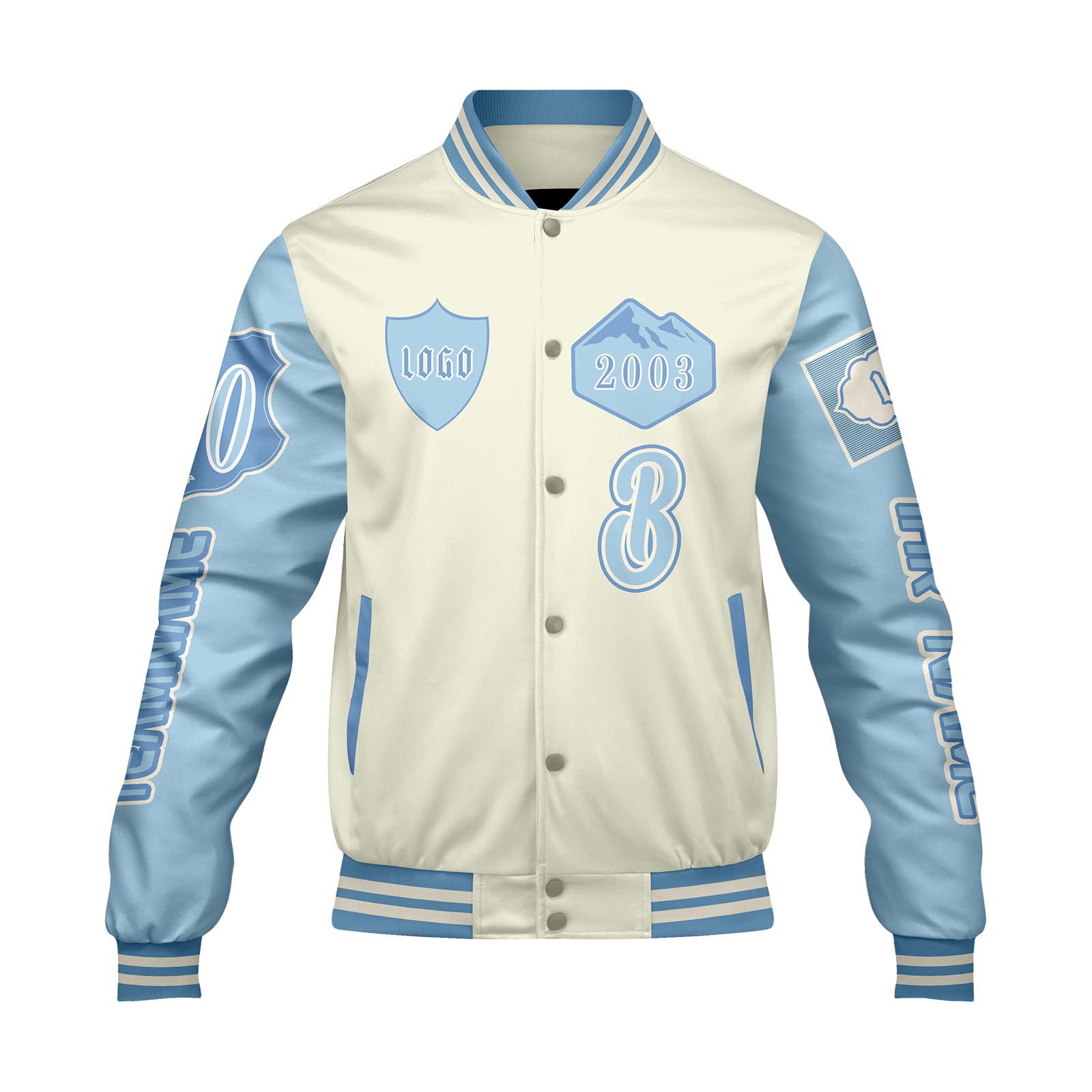 Maßgeschneiderte Weiß Blau Letterman Varsity Jacket Individuelle Stickerei Druck nach Ihrem Wunsch