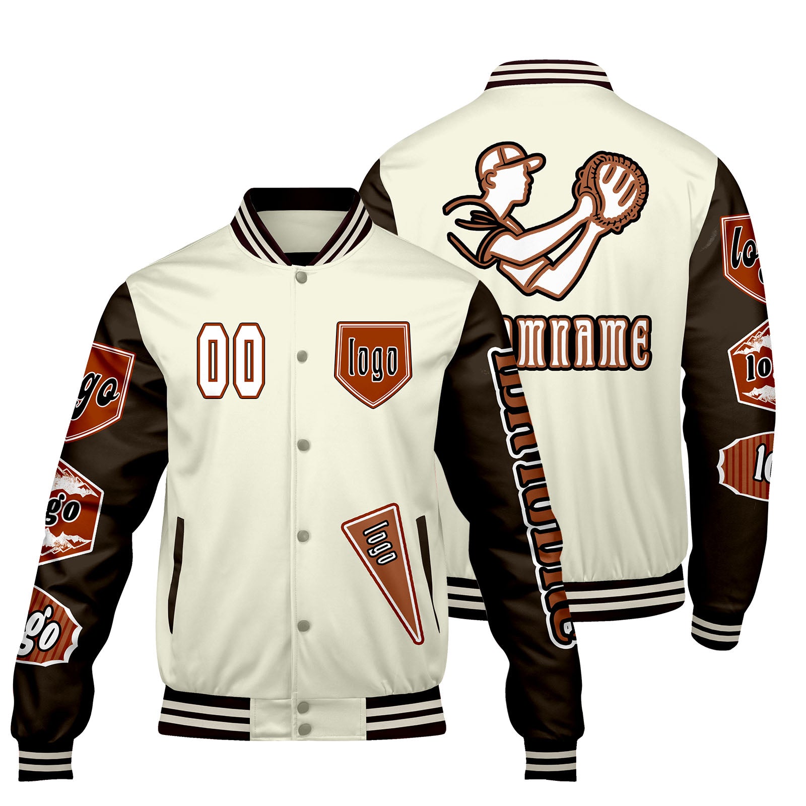 Maßgeschneiderte Weiß Braun Letterman Varsity Jacket Individuelle Stickerei Druck nach Ihrem Wunsch