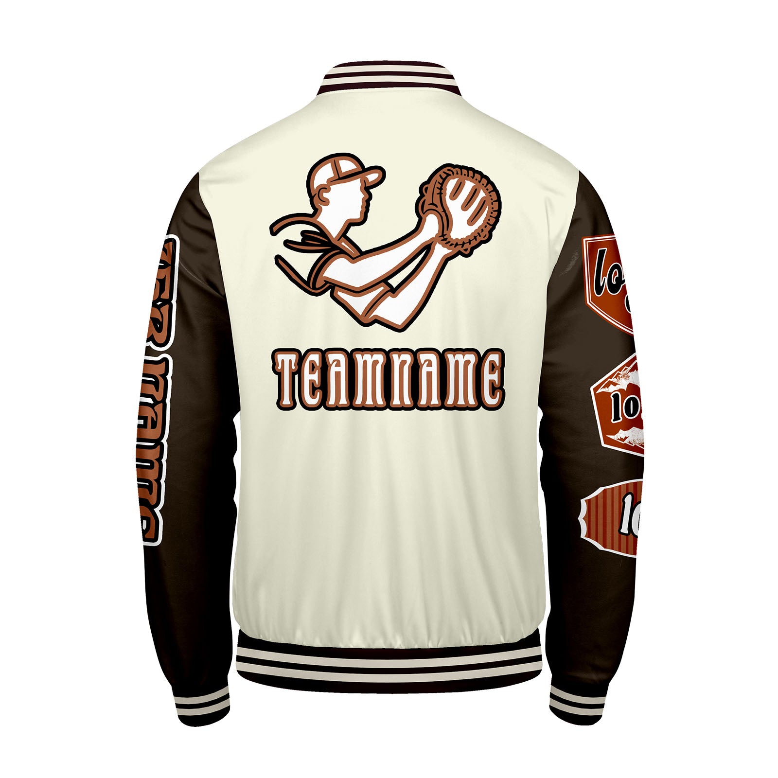 Maßgeschneiderte Weiß Braun Letterman Varsity Jacket Individuelle Stickerei  Druck nach Ihrem Wunsch
