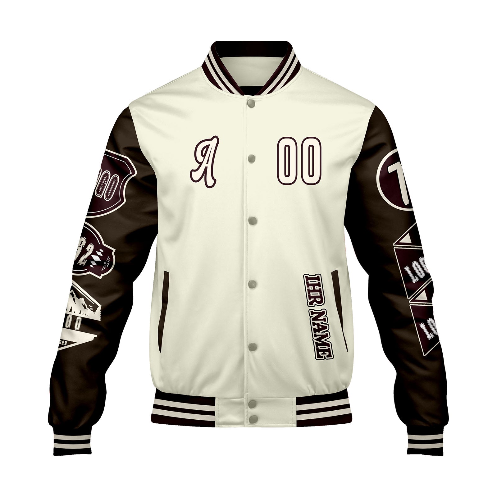 Maßgeschneiderte Weiß Braun Letterman Varsity Jacket Individuelle Stickerei Druck nach Ihrem Wunsch