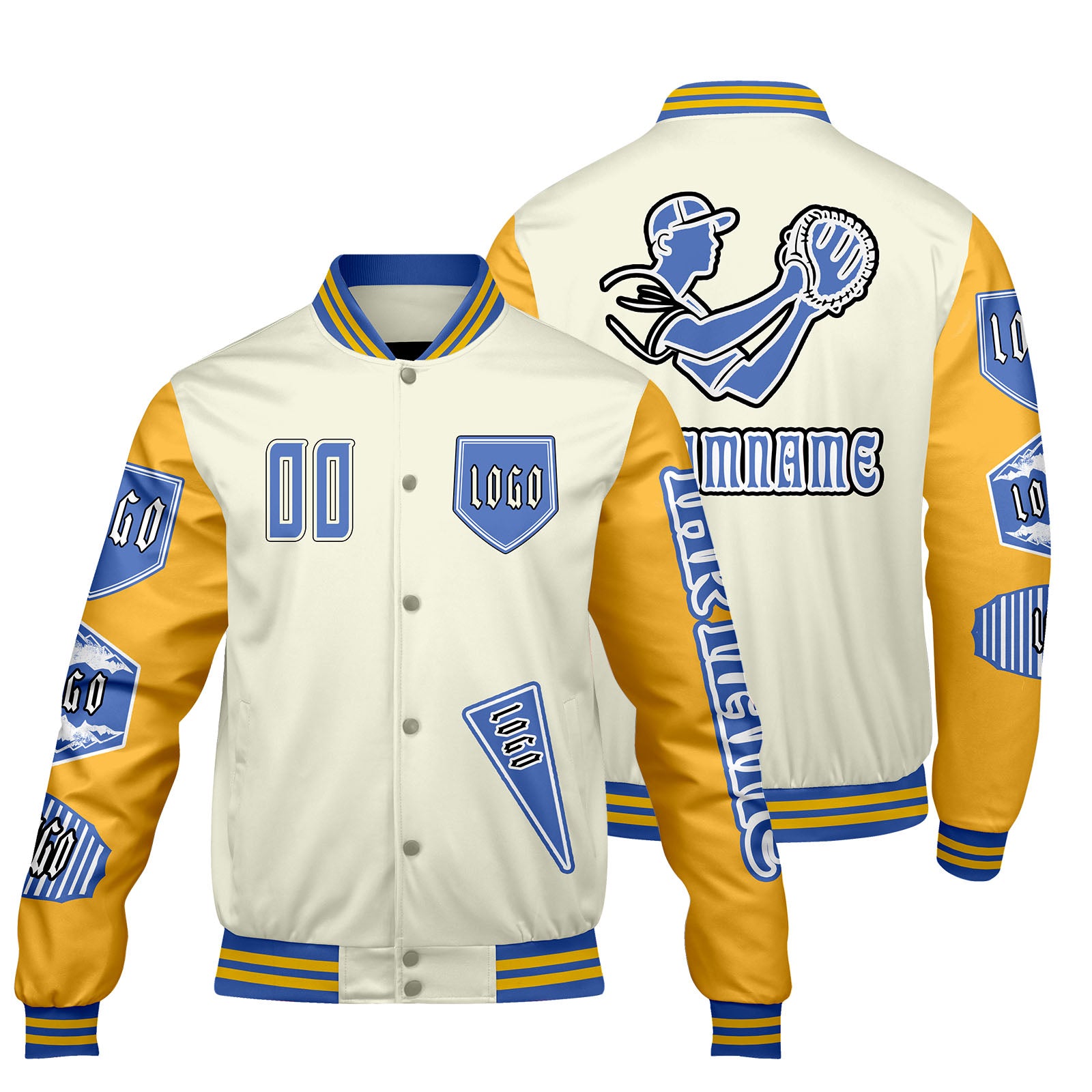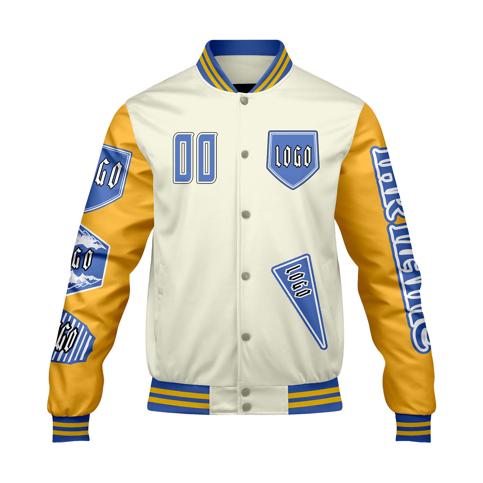 Maßgeschneiderte Weiß Gelb Letterman Varsity Jacket Individuelle Stickerei Druck nach Ihrem Wunsch