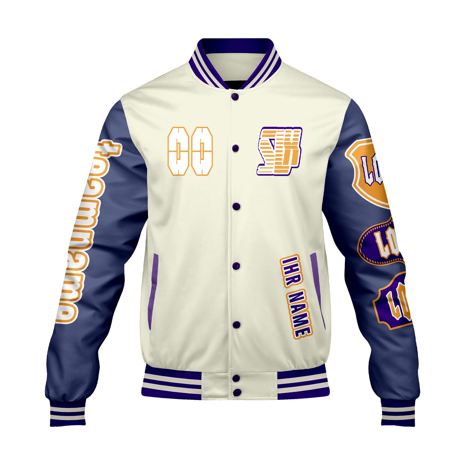 Maßgeschneiderte Weiß Lila Letterman Varsity Jacket Individuelle Stickerei Druck nach Ihrem Wunsch