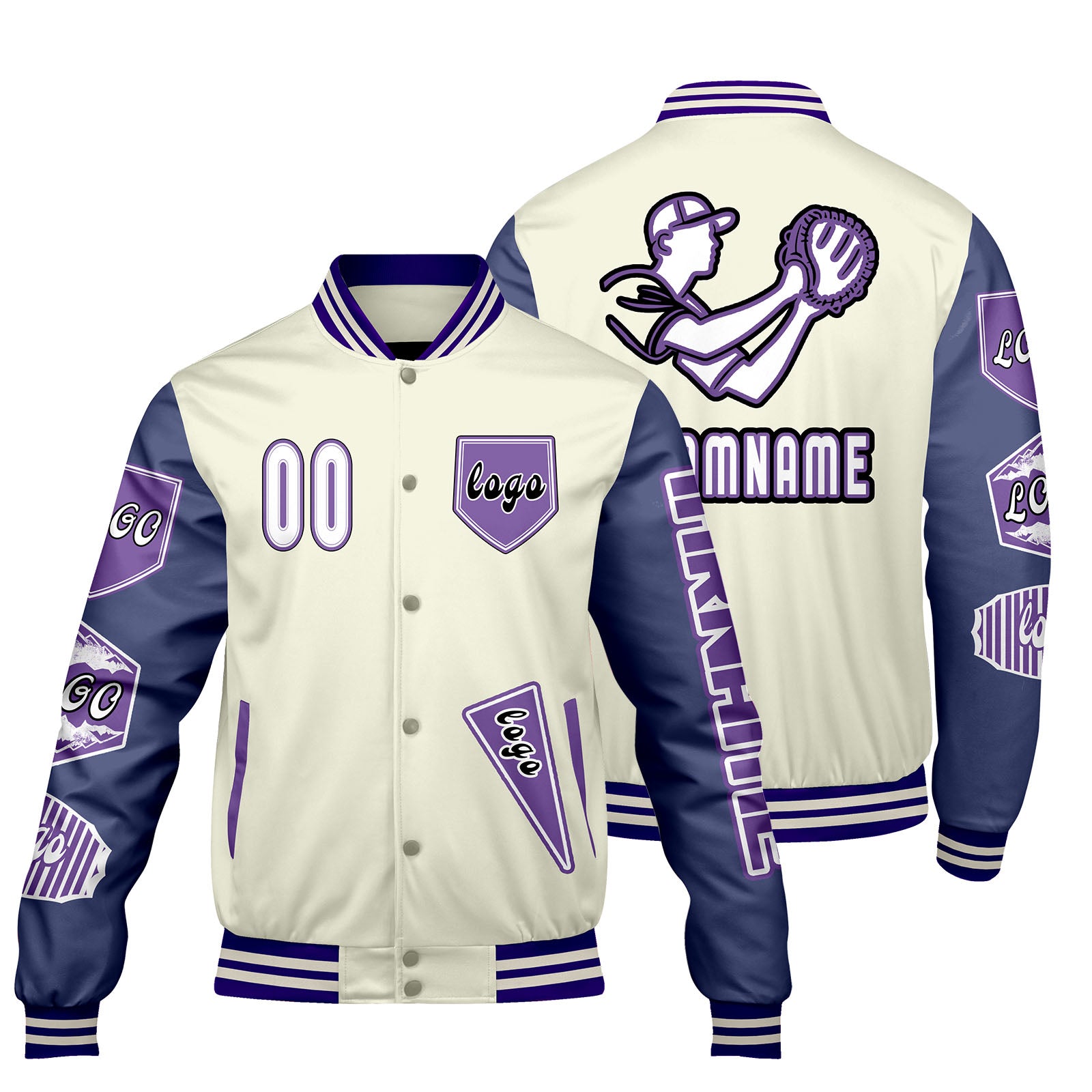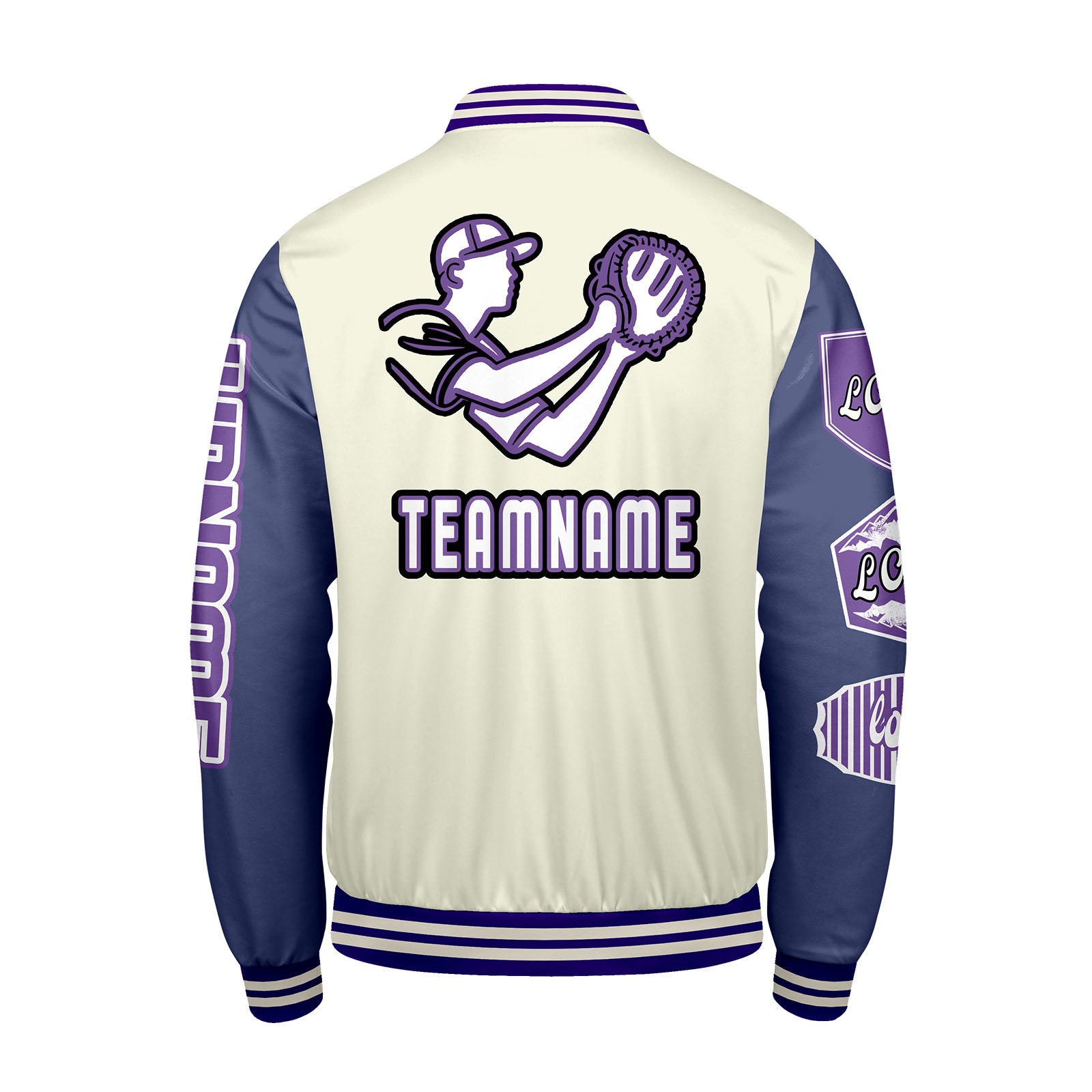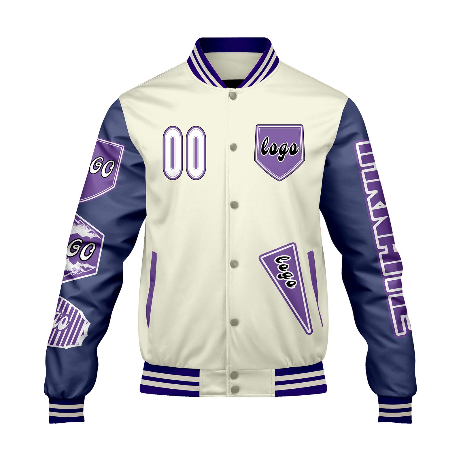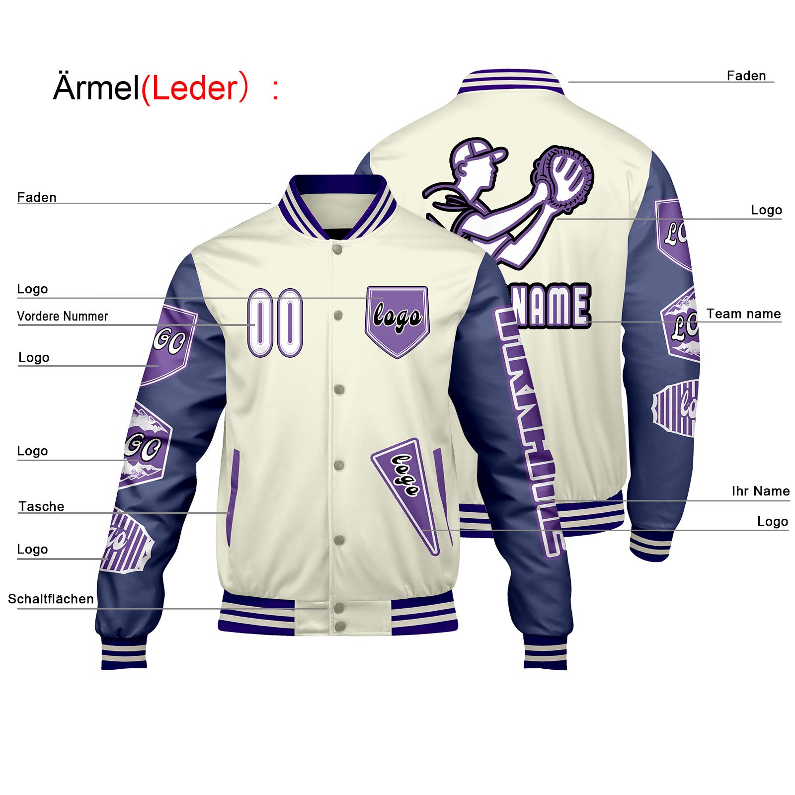 Maßgeschneiderte Weiß Lila Letterman Varsity Jacket Individuelle Stickerei Druck nach Ihrem Wunsch
