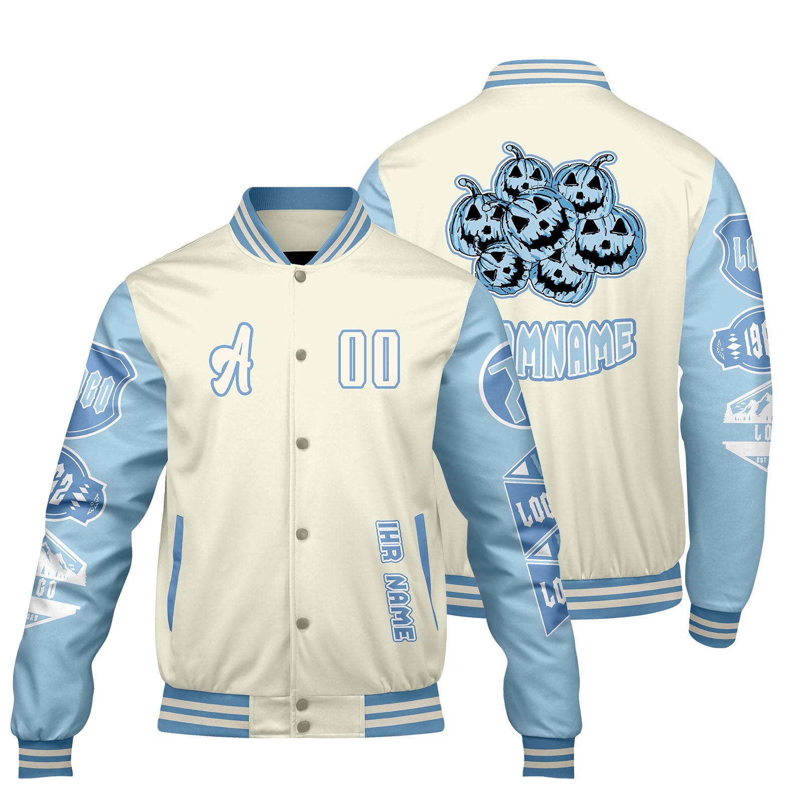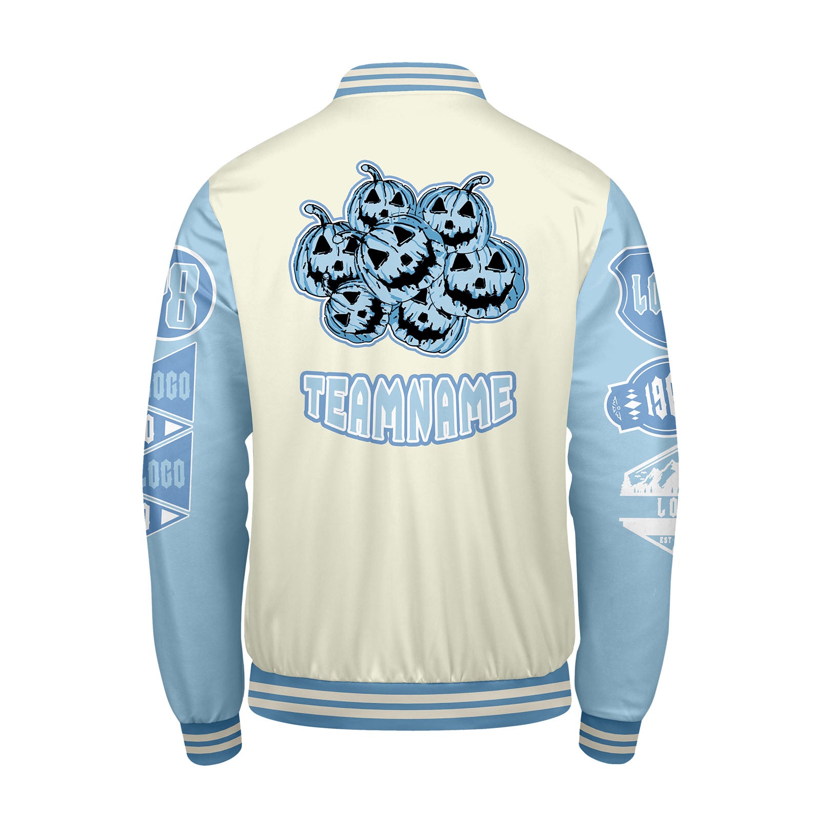 Maßgeschneiderte Weiß Löwenblau Letterman Varsity Jacket Individuelle Stickerei  Druck nach Ihrem Wunsch