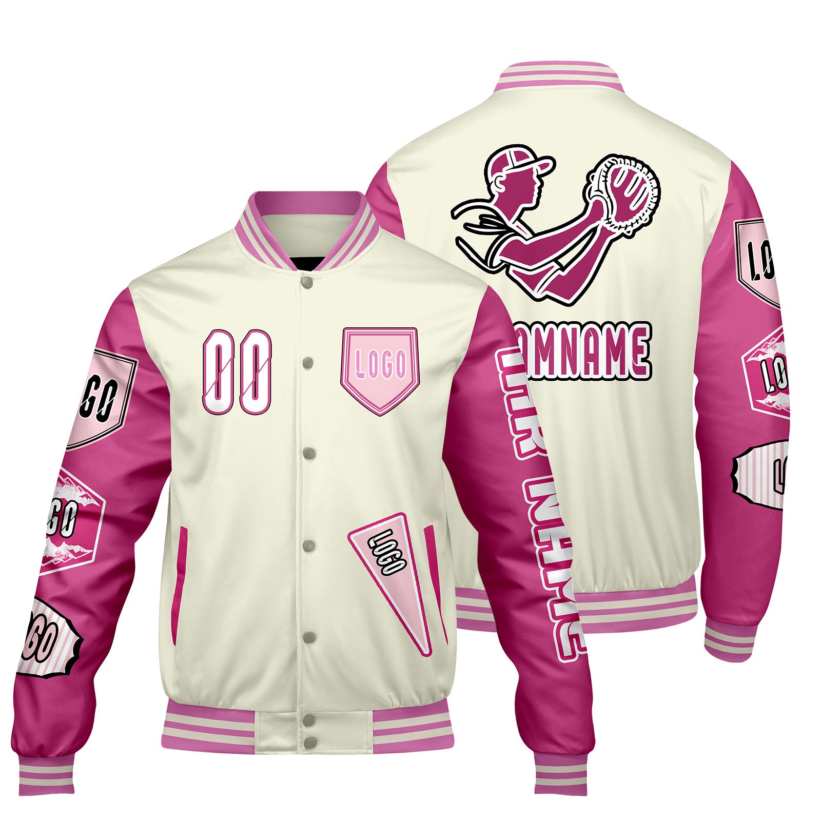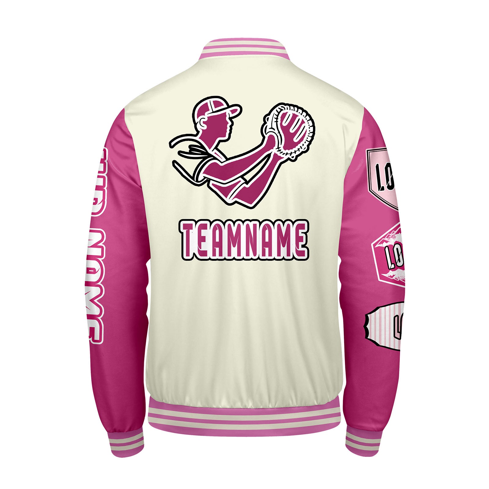 Maßgeschneiderte Weiß Rosa Letterman Varsity Jacket Individuelle Stickerei Druck nach Ihrem Wunsch