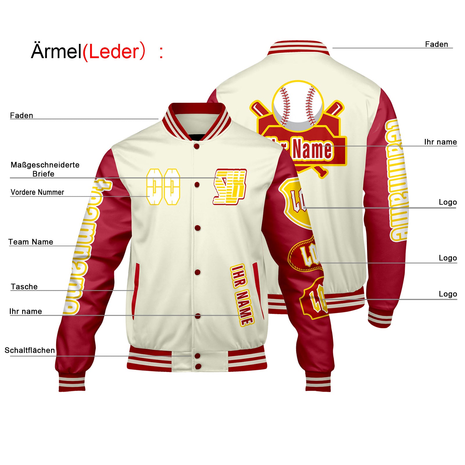 Maßgeschneiderte Weiß Rot Letterman Varsity Jacket Individuelle Stickerei Druck nach Ihrem Wunsch