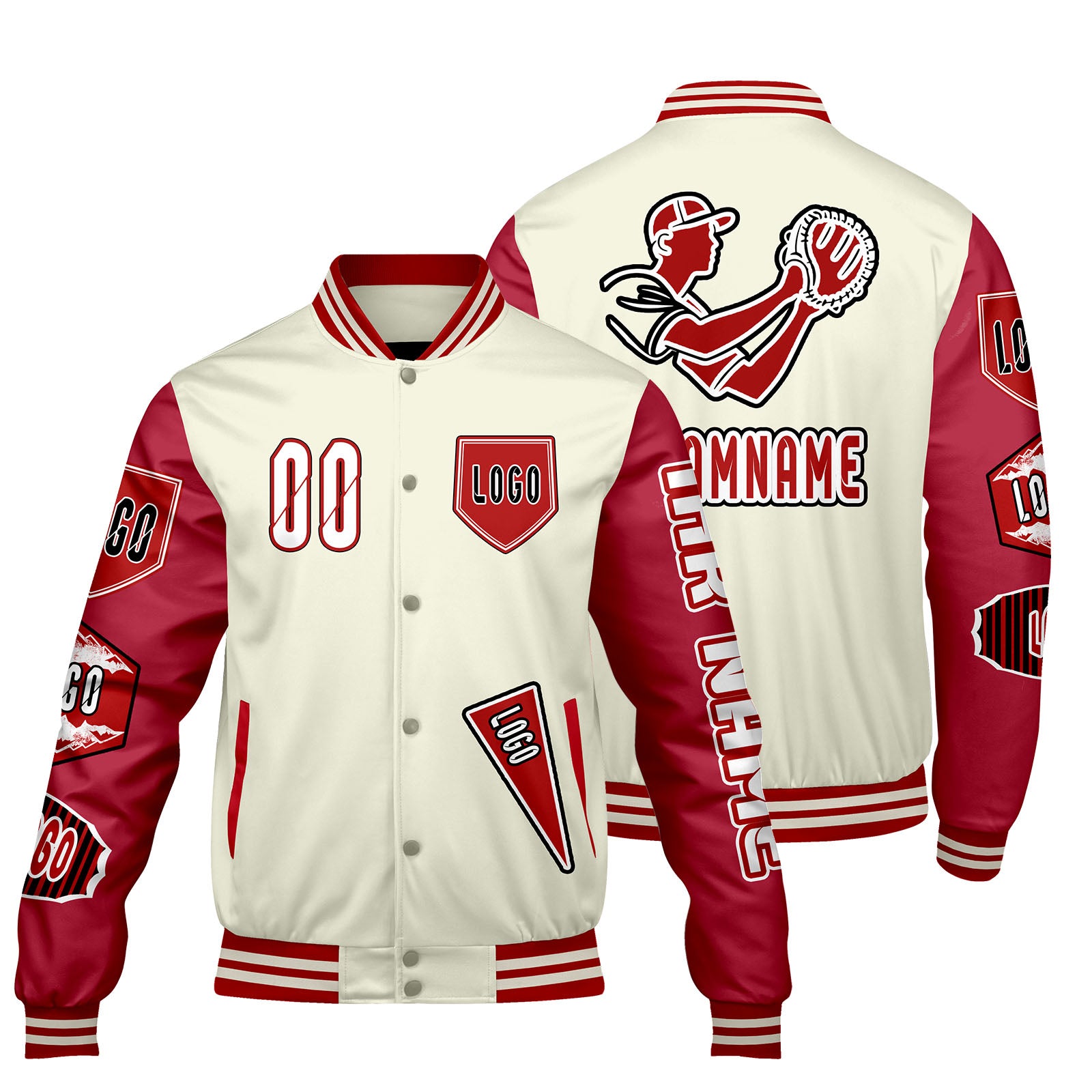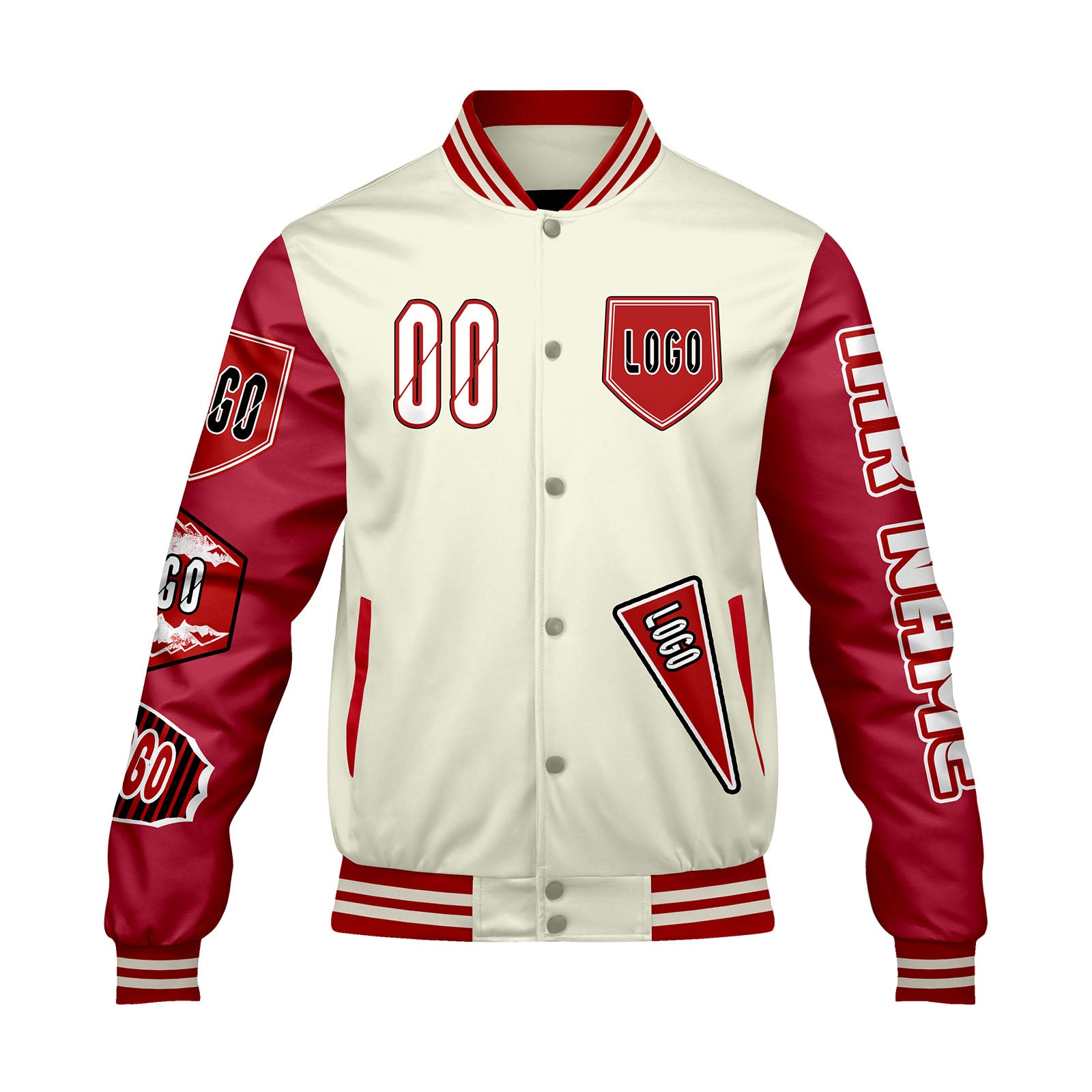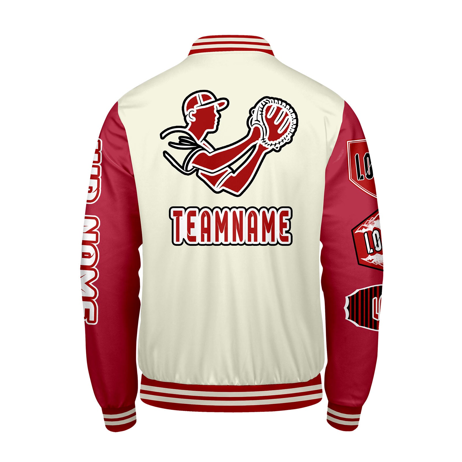Maßgeschneiderte Weiß Rot Letterman Varsity Jacket Individuelle Stickerei Druck nach Ihrem Wunsch